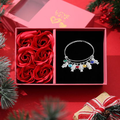 5 Names-Personalized Kid Charms Bangle Adjustable Bracelet Set With Rose Box-Customized 5 Birthstones Gift for Her