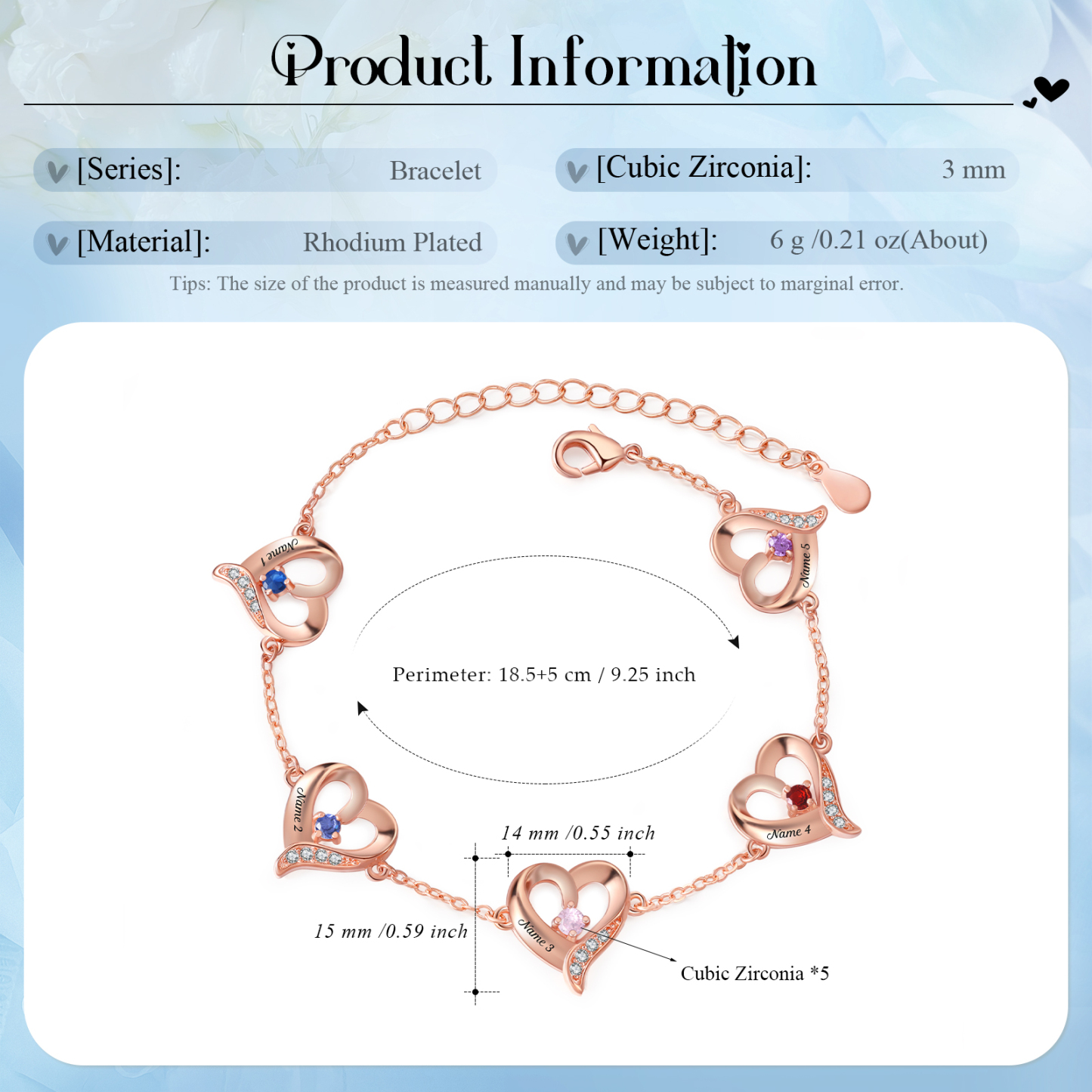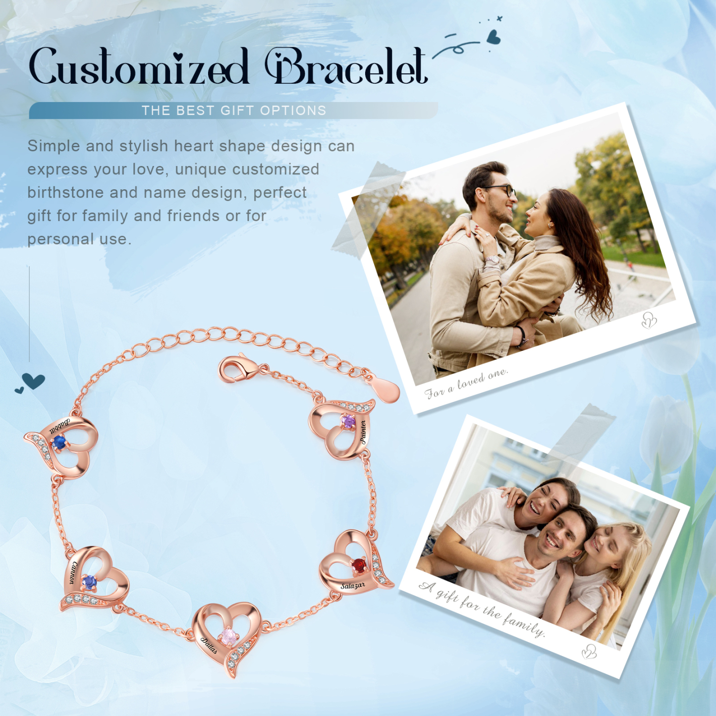 This exquisite bracelet allows you to customize it with up to 7 names and birthstones, making it a unique and meaningful piece just for you or your loved ones. The adjustable length ensures a perfect fit, catering to various wrist sizes. Crafted with meticulous attention to detail, this bracelet showcases the beauty of fine craftsmanship and personalization.