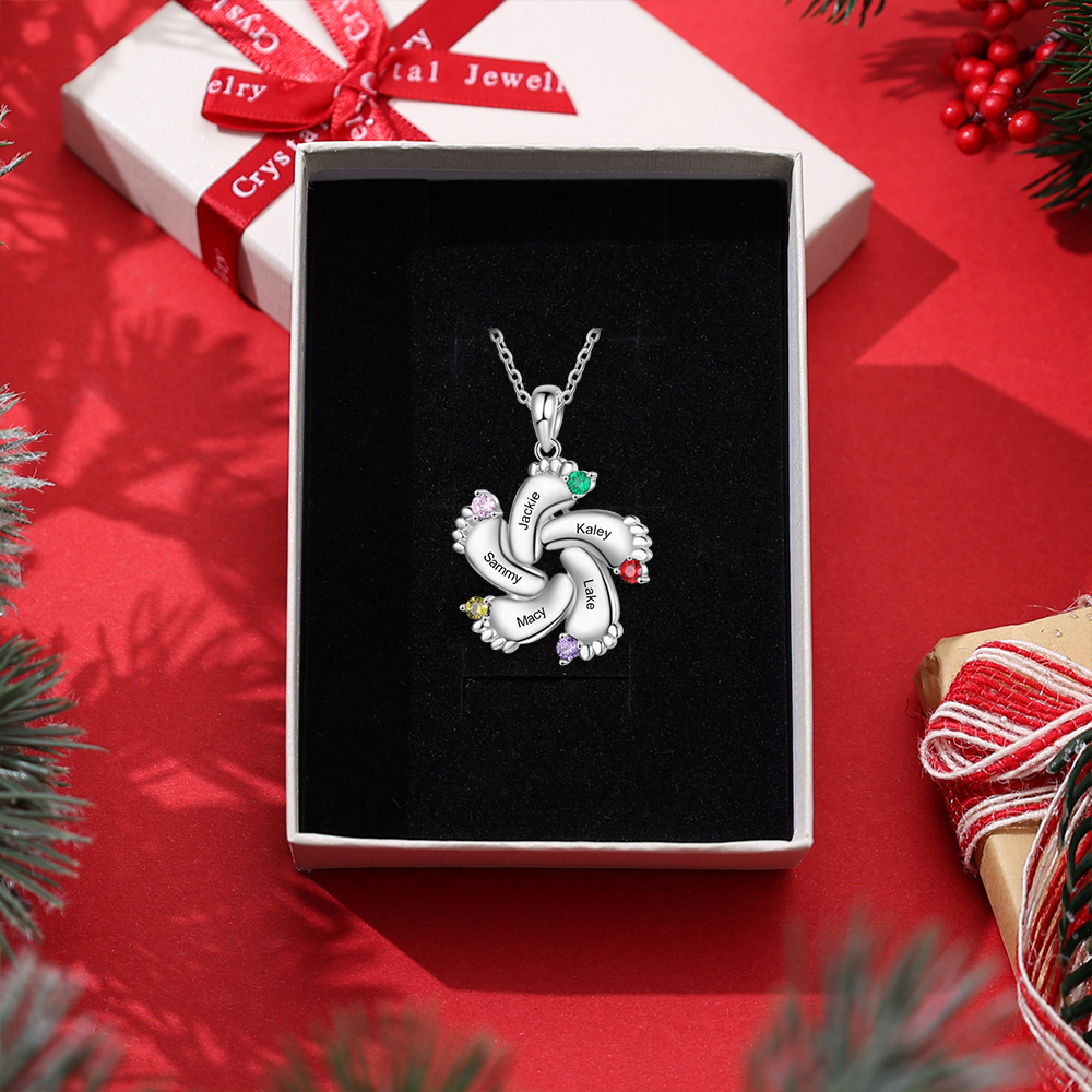 5 Names-Personalized Baby Foot Necklace Set With Gift Box-Custom Women Necklace With 5 Birthstones Engraved Names Gift For Mother/Nan/Her