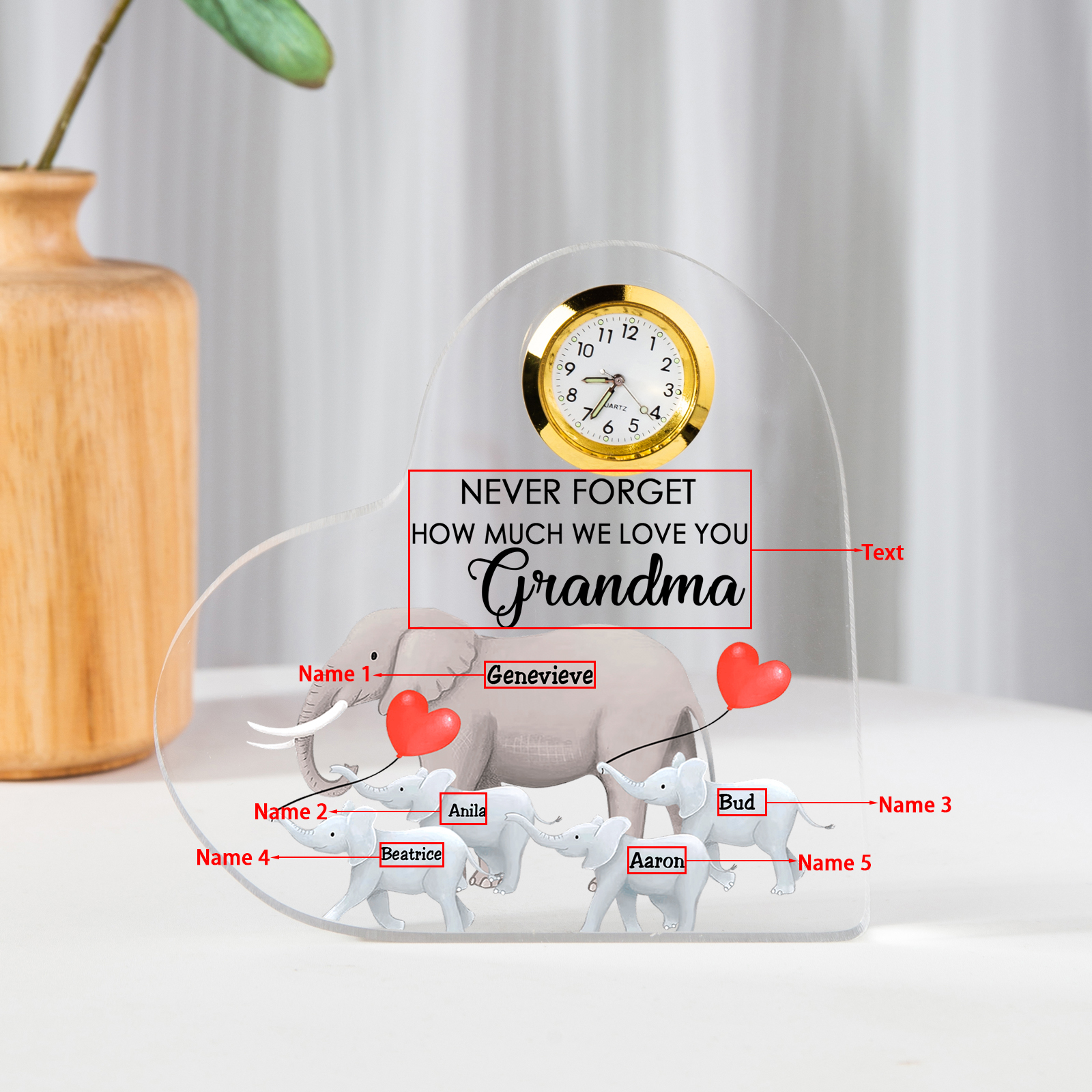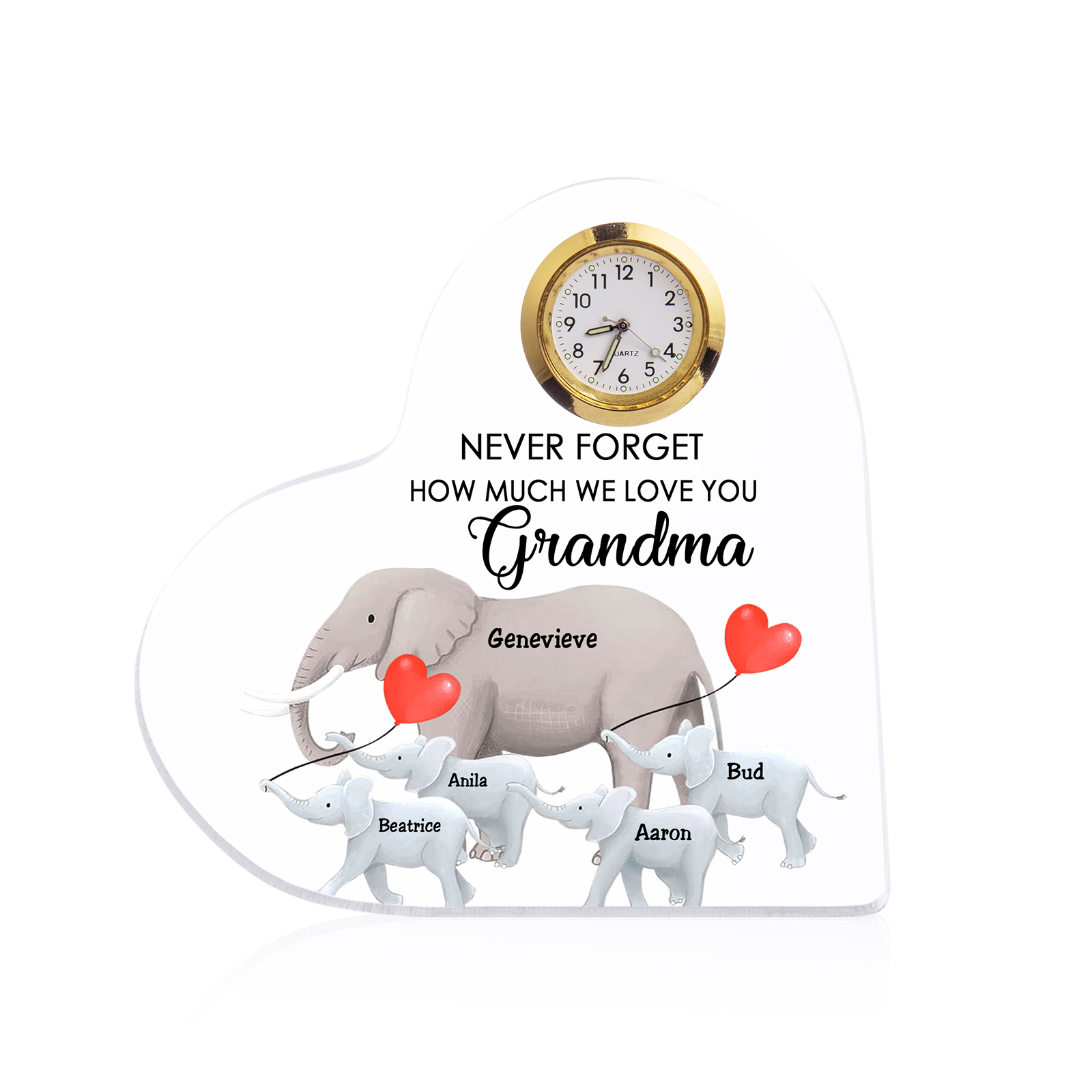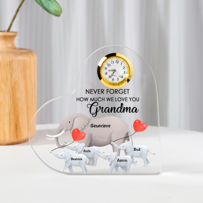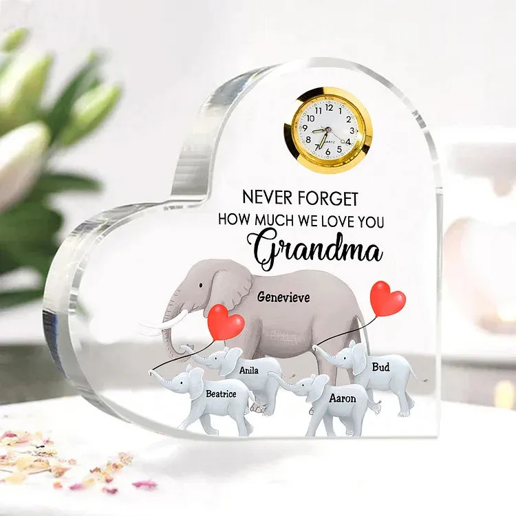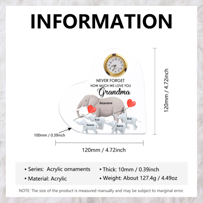 5 Names-Personalized Grandma Name Acrylic Clock Gifts-Custom Acrylic Elephant Heart Keepsake Desktop Ornament