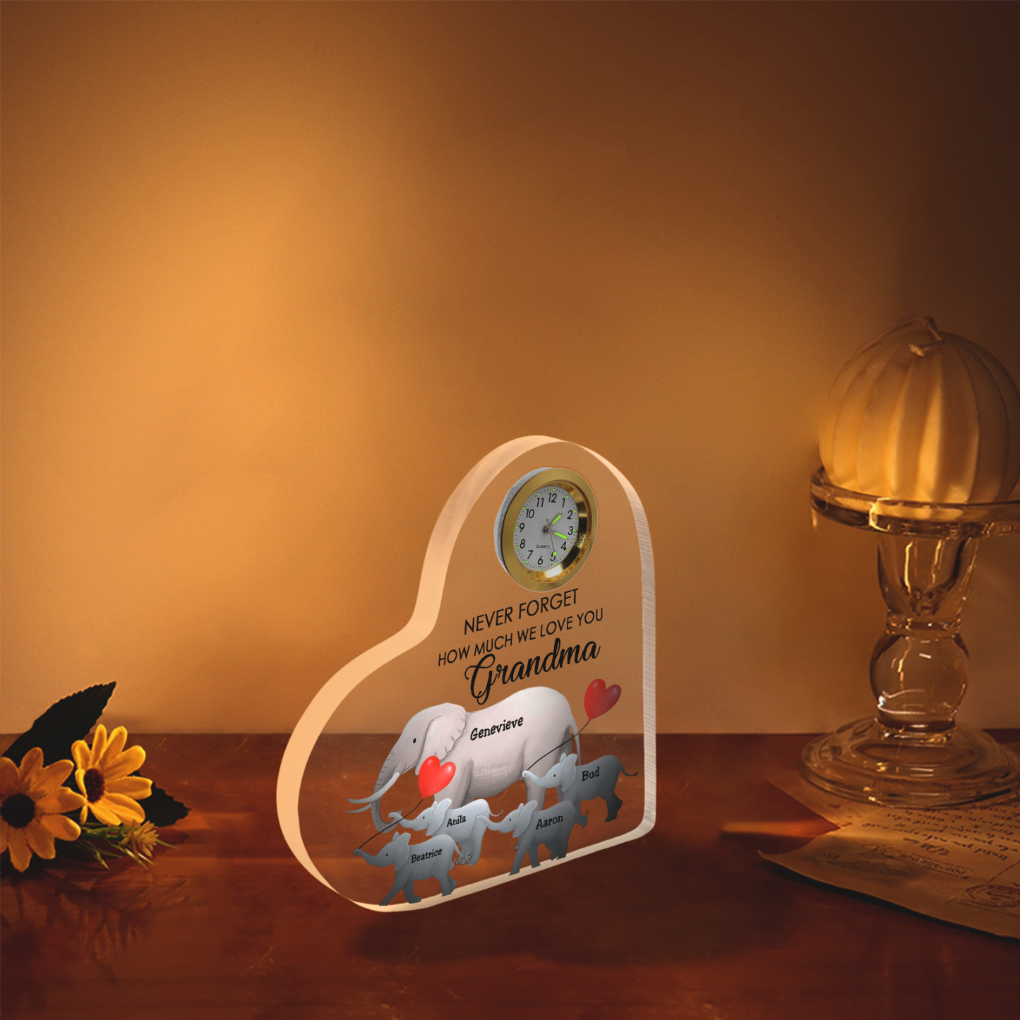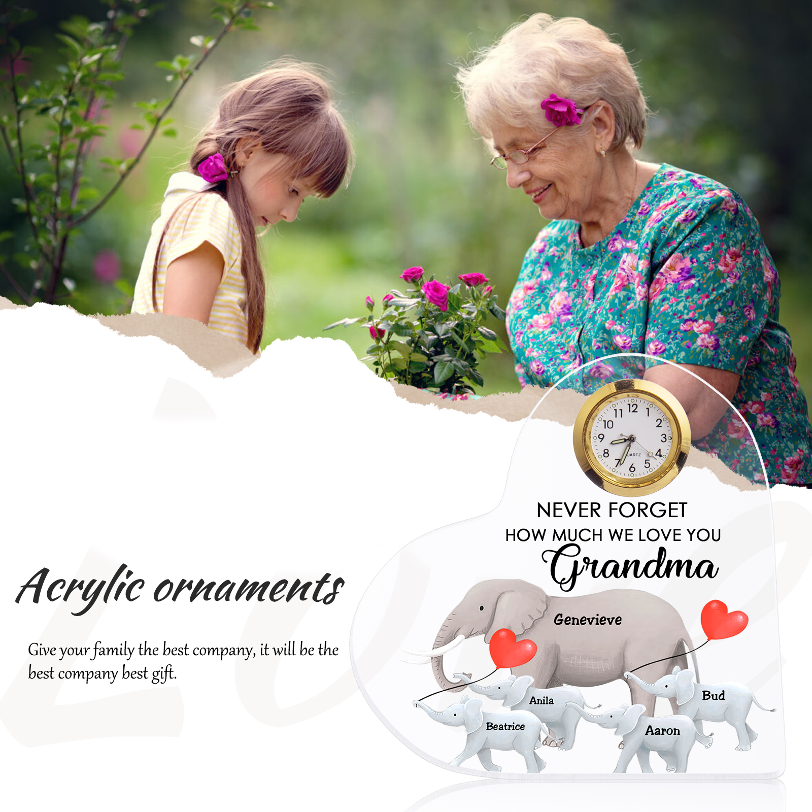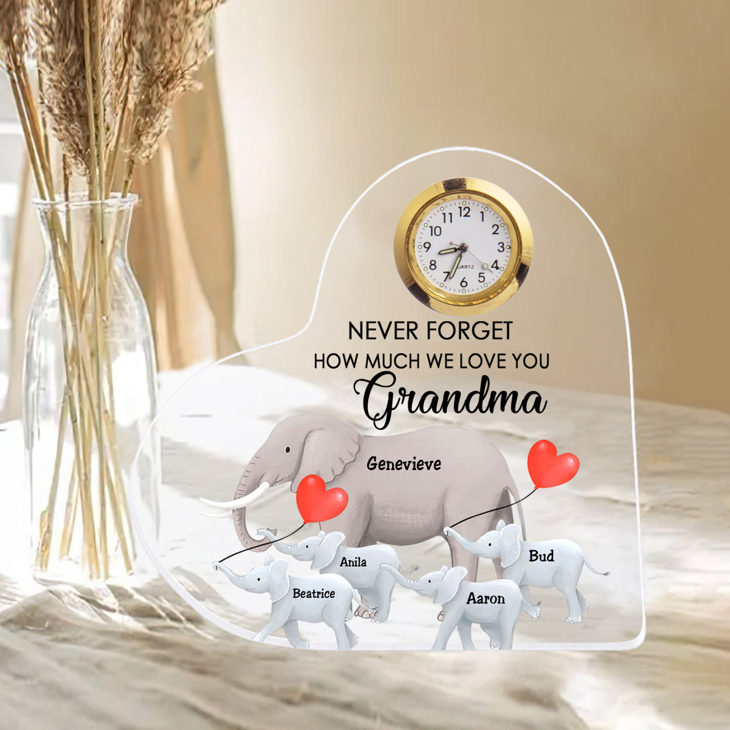 5 Names-Personalized Grandma Name Acrylic Clock Gifts-Custom Acrylic Elephant Heart Keepsake Desktop Ornament