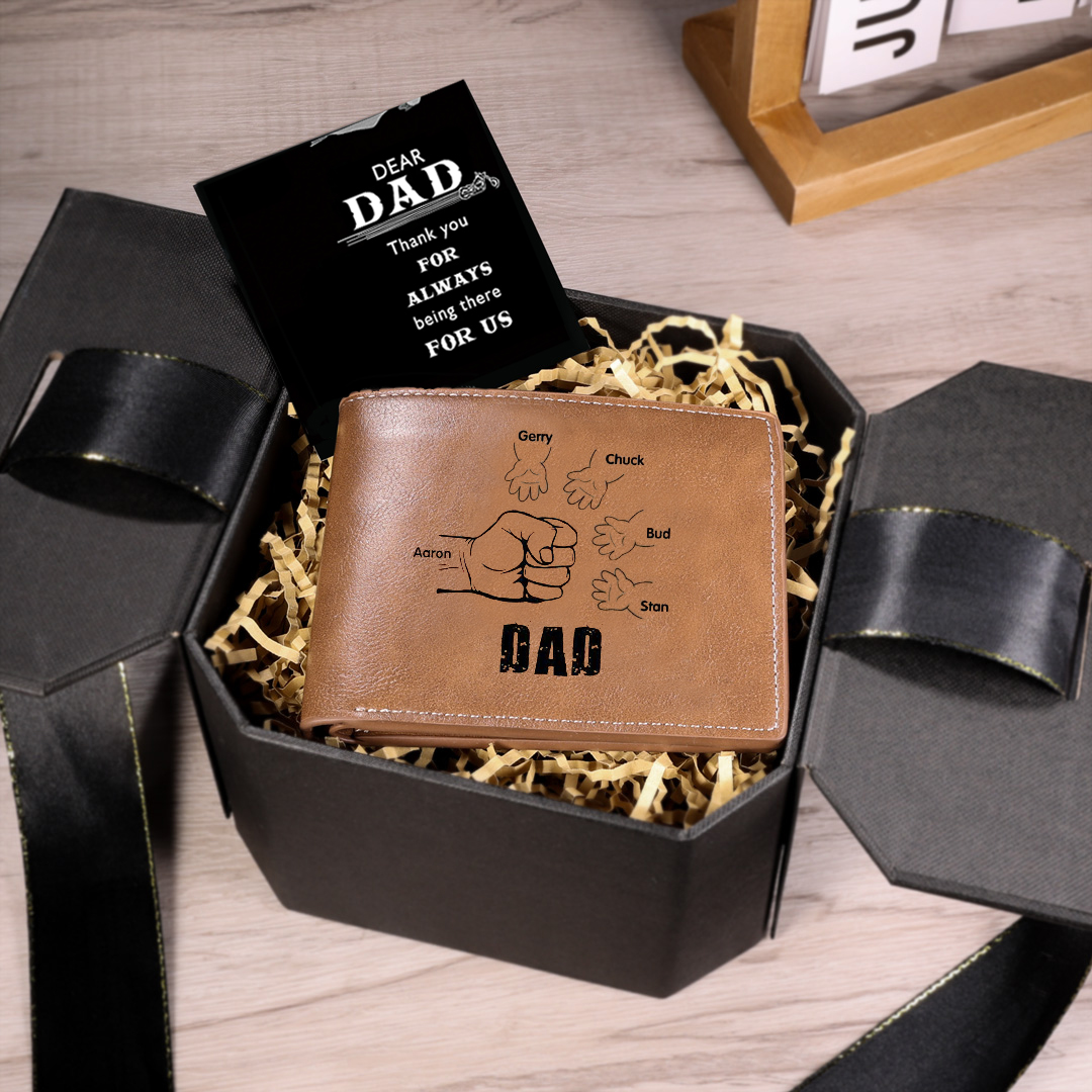 5 Names-Personalized Leather Men Wallet Engraved 5 Names Fist Bump Folding Wallet Gift Set For Dad