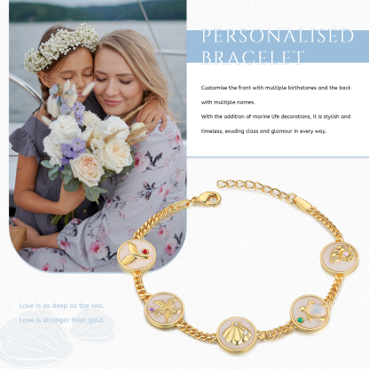 🐚This exquisite bracelet allows you to customize it with up to 5 name and birthstone pendants with marine elements, exquisite three-dimensional shells, starfish, turtle patterns and birthstones are engraved on the pendants, making it a unique and meaningful piece just for you or your loved ones. The adjustable length ensures a perfect fit, catering to various wrist sizes. Crafted with meticulous attention to detail, this bracelet showcases the beauty of fine craftsmanship and personalization.