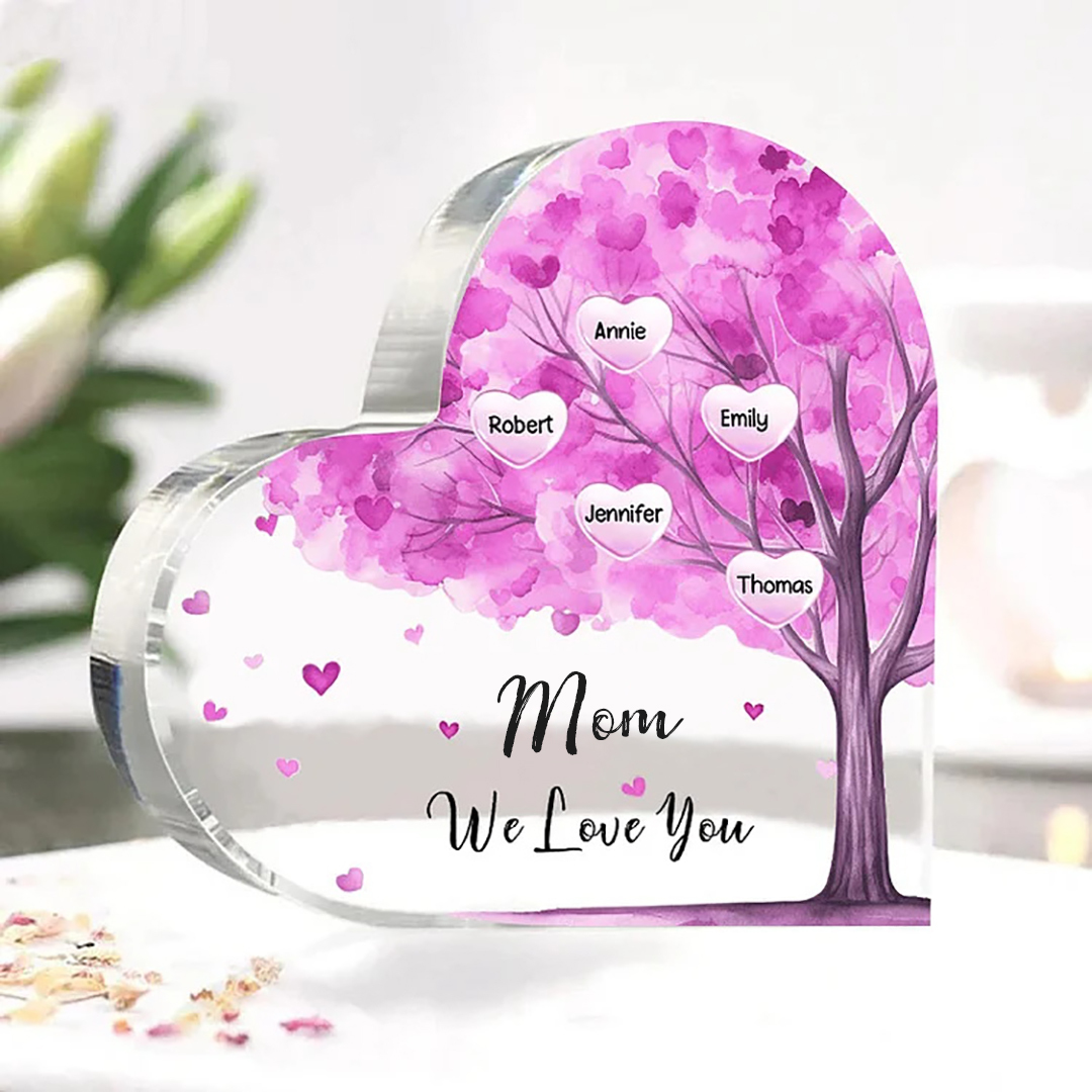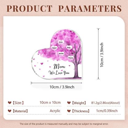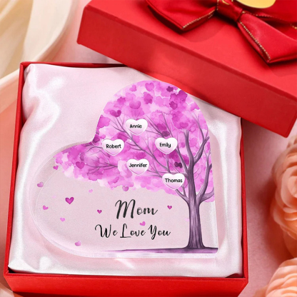 5 Names-Personalized Mom Acrylic Heart Keepsake Custom Text Pink Tree Ornaments Gifts Set With Gift Box for Grandma/Mother