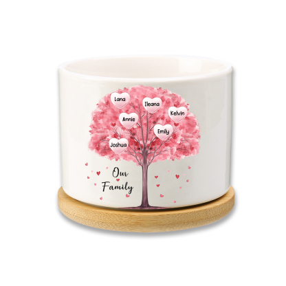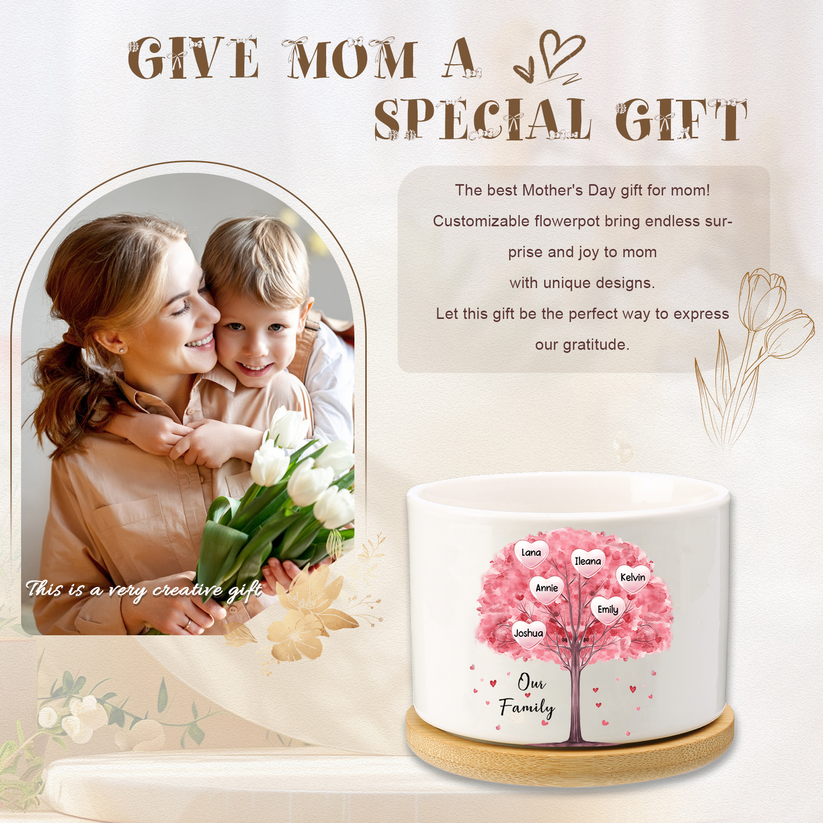6 Names-Personalized Ceramic Flowerpot with Wooden Base Custom 6 Names & 1 Text Pink Family Tree Flowerpot Gift for Mother