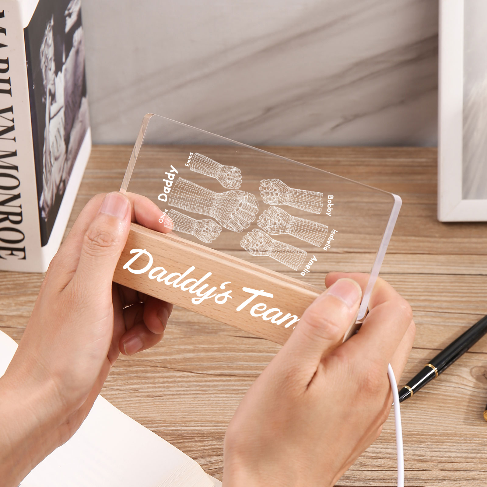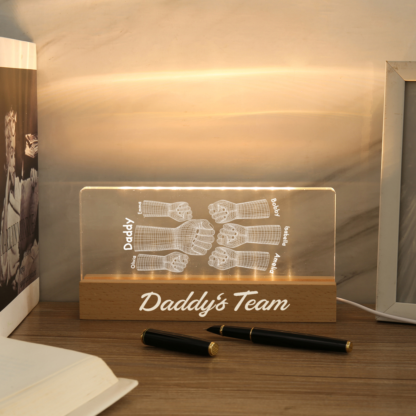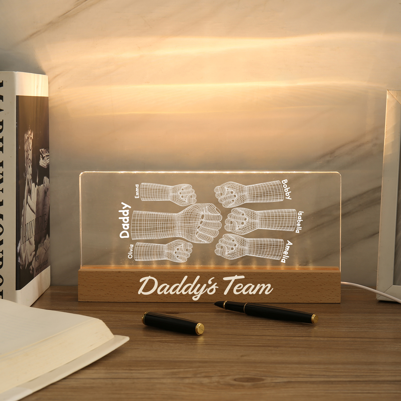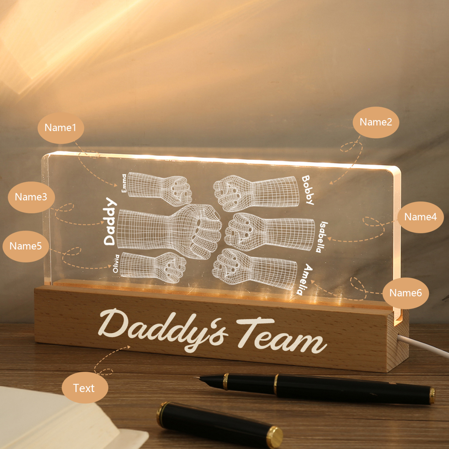💡Customize a 3D Fist Bump Pattern Table Lamp with Dad's Name! 🌟 Give your father a unique gift that lights up his world. ❤️Personalized with his name, this sleek table lamp featuring an impressive 3D fist bump design will add a touch of modern flair to his space. Illuminate his days with personalized warmth and style. Order now to brighten up his day! 🥰
