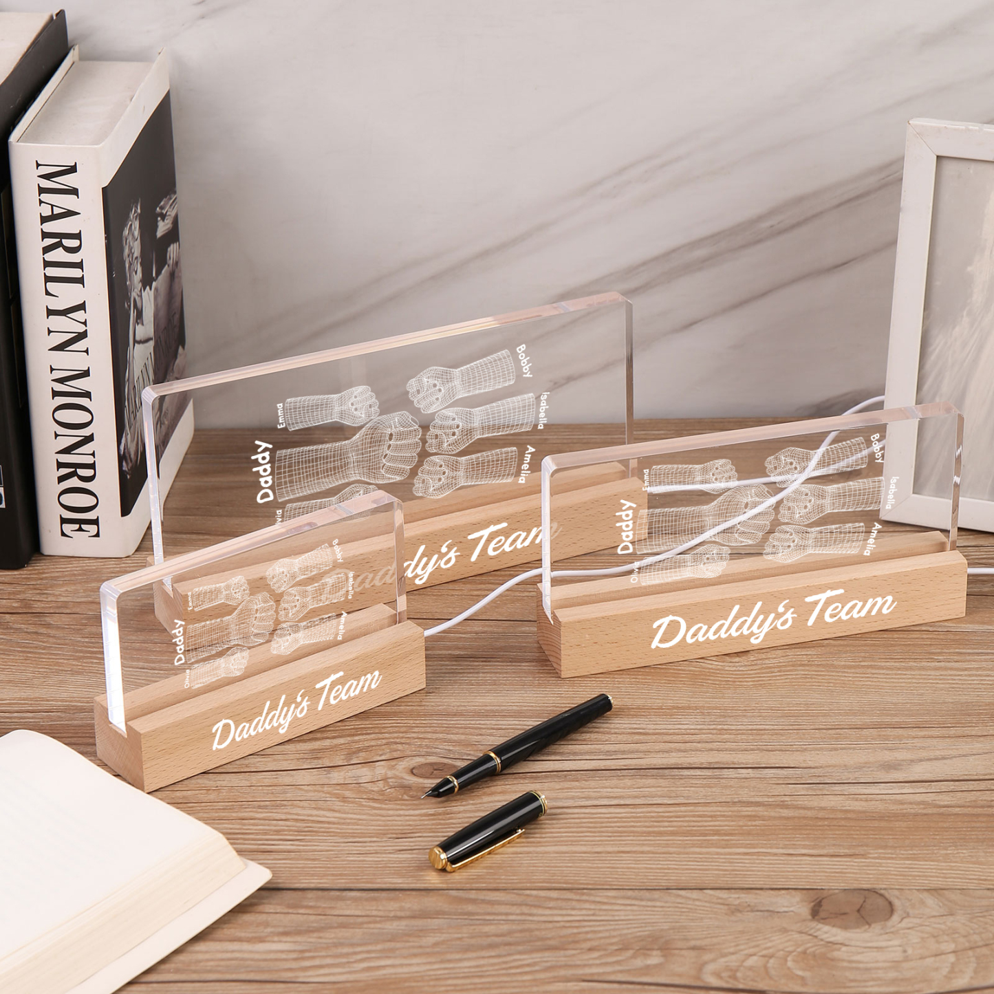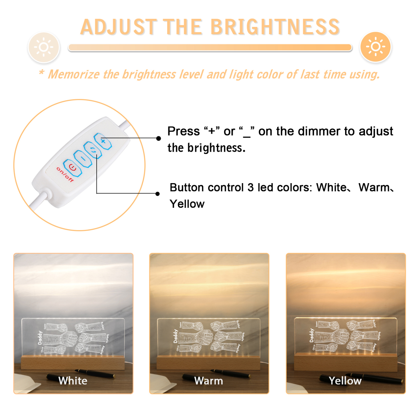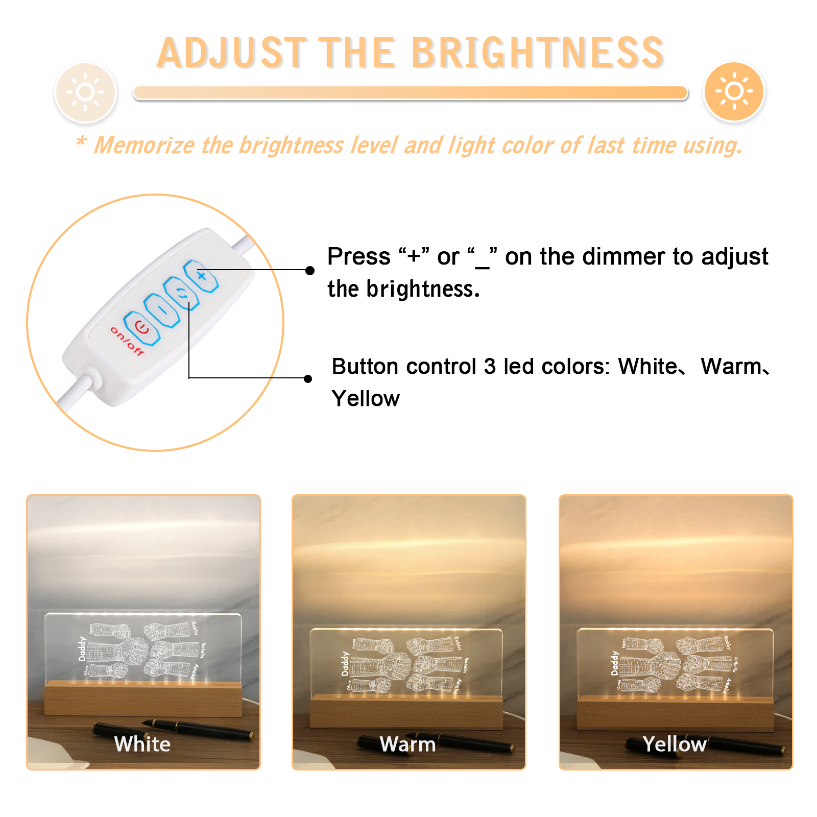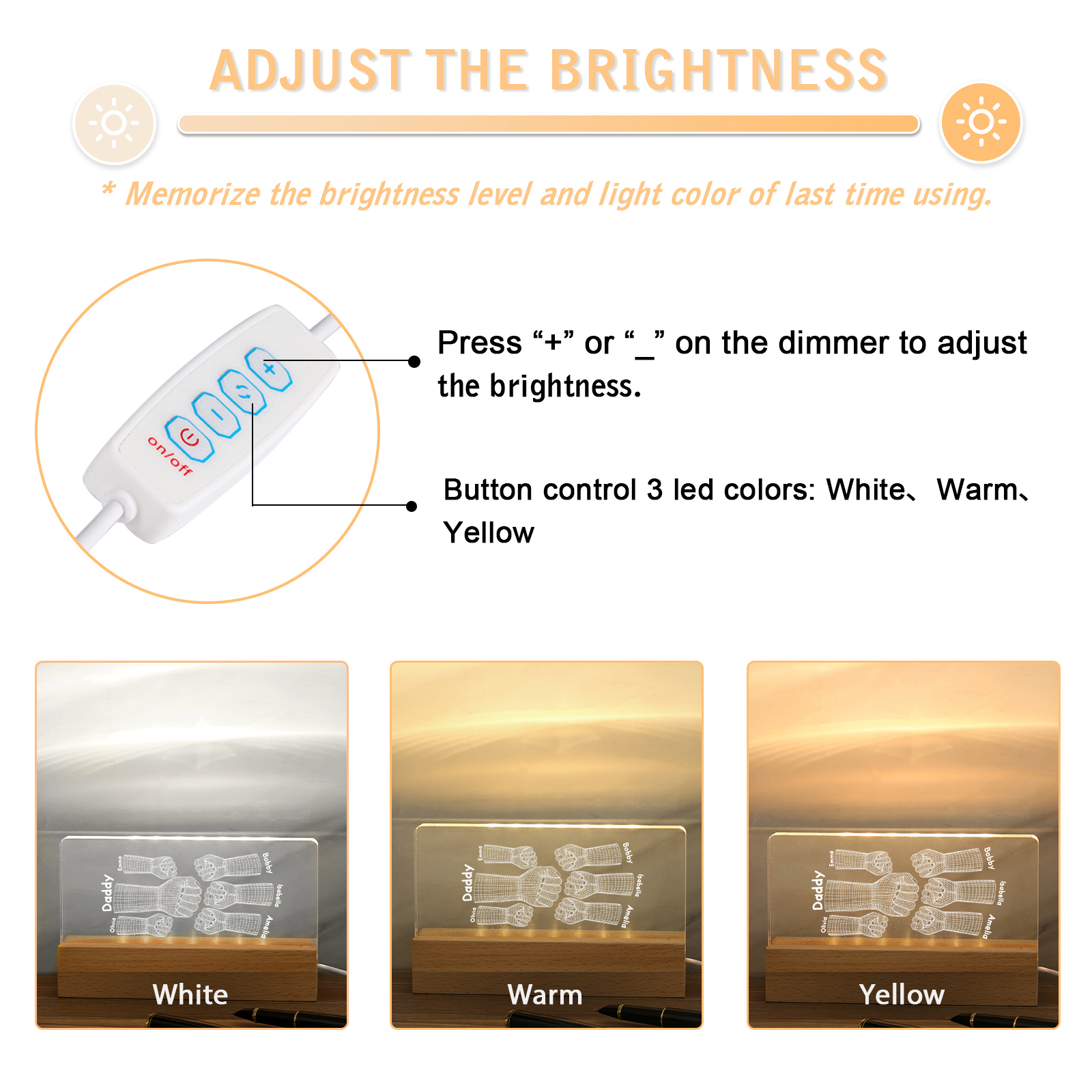 💡Customize a 3D Fist Bump Pattern Table Lamp with Dad's Name! 🌟 Give your father a unique gift that lights up his world. ❤️Personalized with his name, this sleek table lamp featuring an impressive 3D fist bump design will add a touch of modern flair to his space. Illuminate his days with personalized warmth and style. Order now to brighten up his day! 🥰