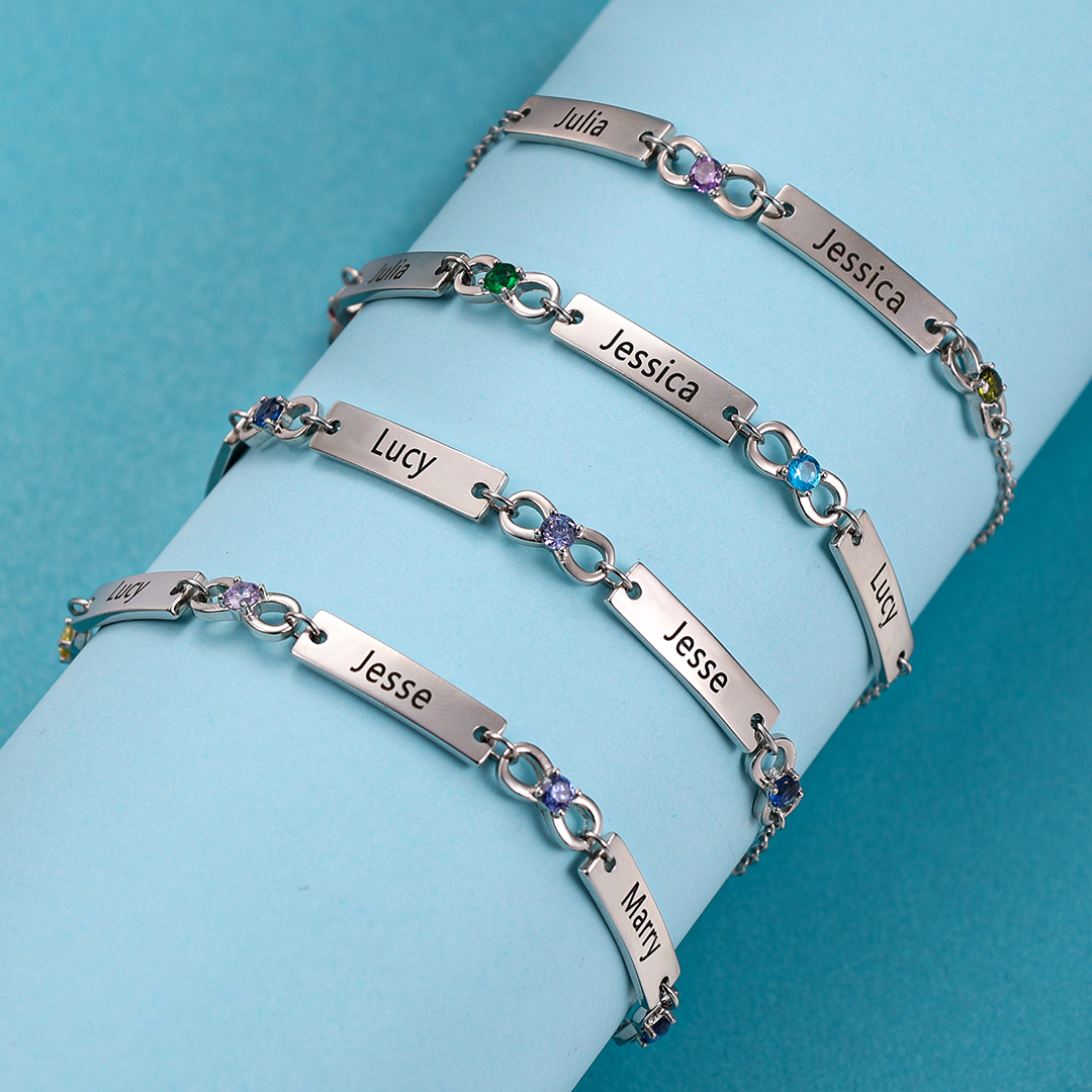 Its infinity loop design symbolizes eternal love and connection, making it an ideal keepsake for someone special. With its beautiful array of names and birthstones, this bracelet is a testament to the bonds we hold dear. Embrace timeless elegance and celebrate the moments that matter most with our Infinite Loop Ladies' Bracelet.