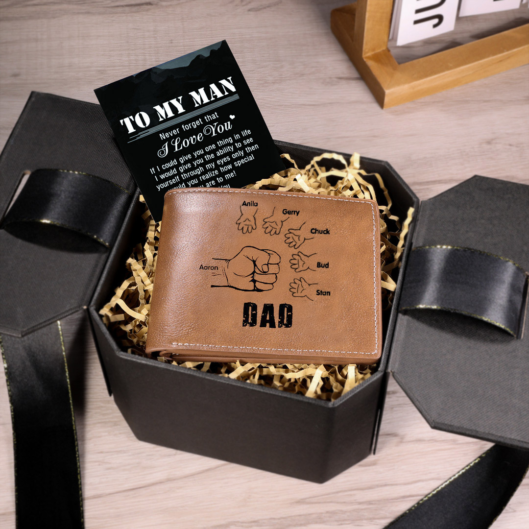 6 Names-Personalized Leather Men Wallet Engraved 6 Names Fist Bump Folding Wallet Gift Set For Dad