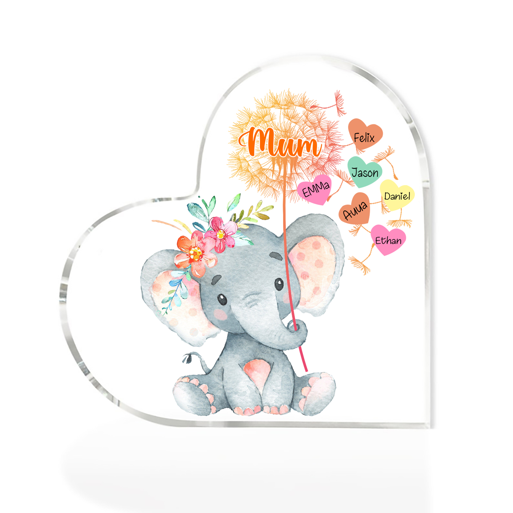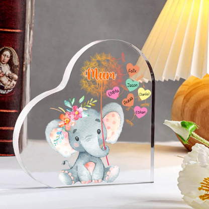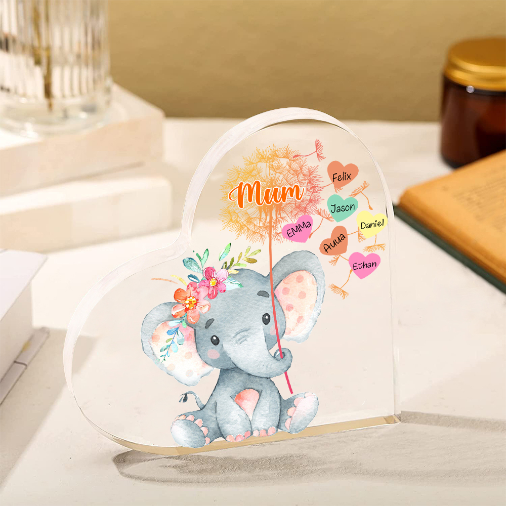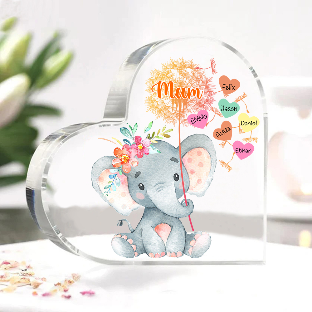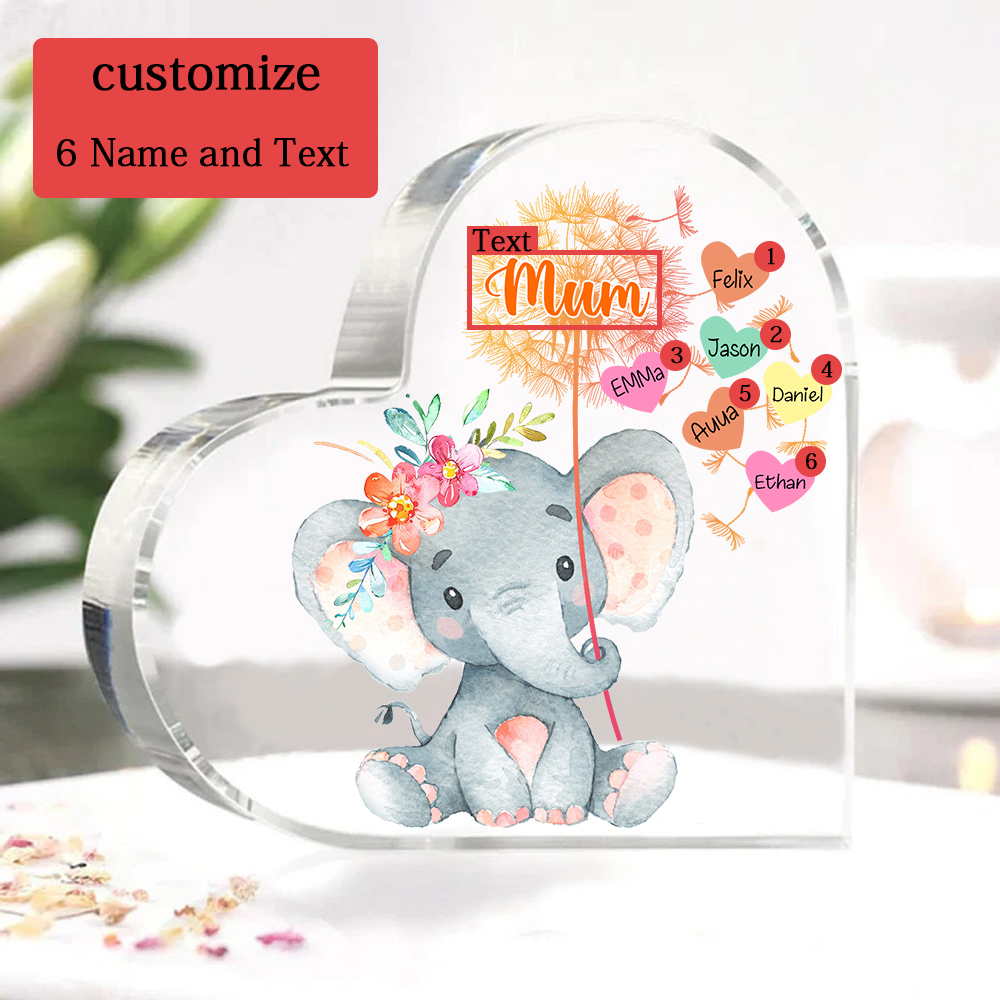 6 Names-Personalized Mum Acrylic Heart Keepsake Custom Text Love Elephant Ornaments Gifts Set With Gift Box for Grandma/Mother