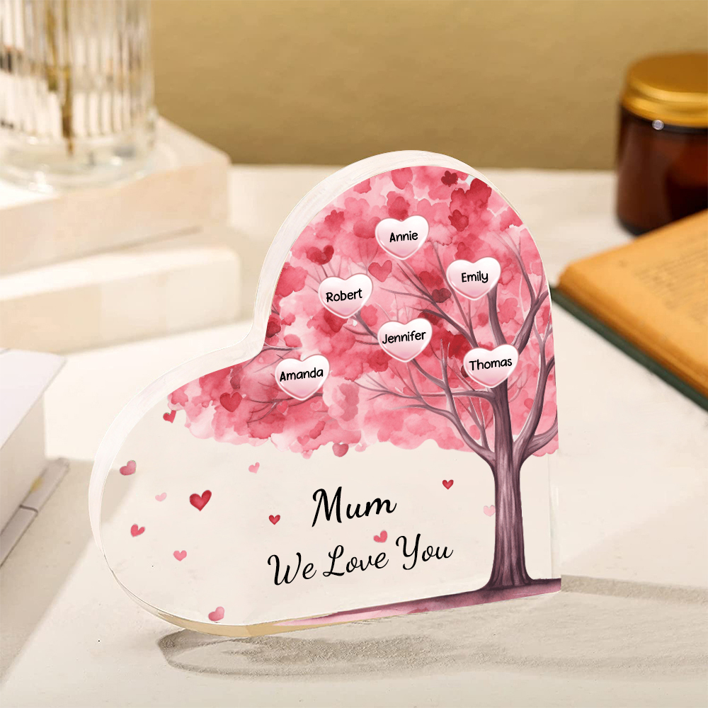 6 Names-Personalized Mom Acrylic Heart Keepsake Custom Text Pink Tree Ornaments Gifts Set With Gift Box for Grandma/Mother