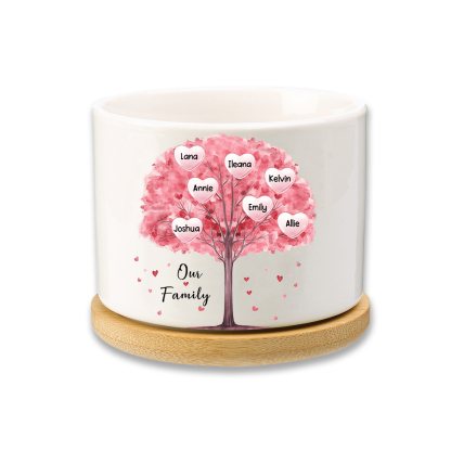 7 Names-Personalized Ceramic Flowerpot with Wooden Base Custom 7 Names & 1 Text Pink Family Tree Flowerpot Gift for Mother