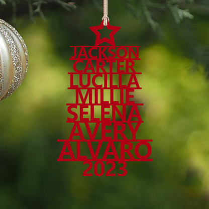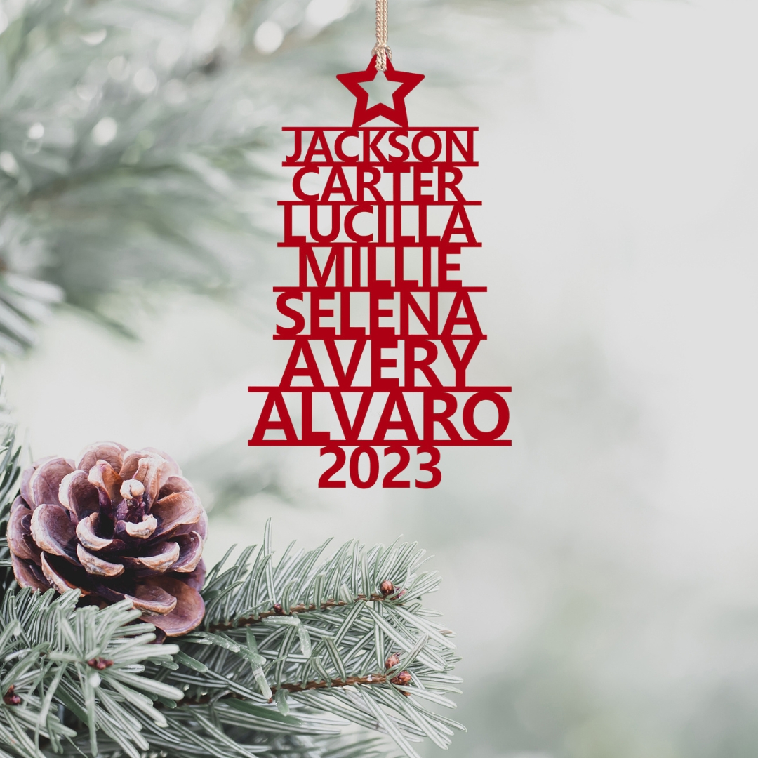 🎁Our customizable Christmas tree ornament, the "Name Tree!" This exquisite ornament allows you to personalize your tree with 2-14 names and a year of your choice. The names elegantly stack upon one another, forming the beautiful shape of a Christmas tree. Choose from three enchanting colors: red, green, and wood.