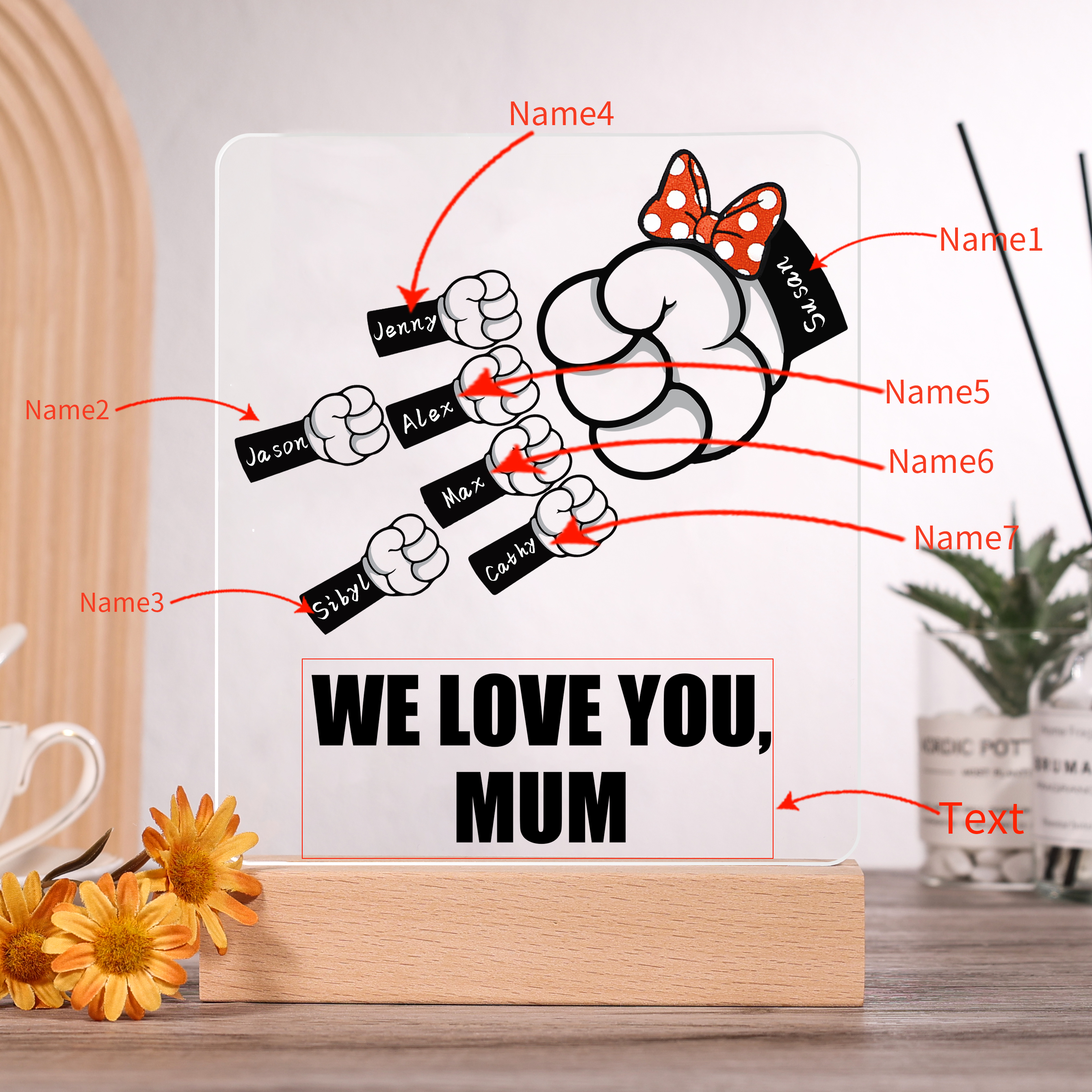 -Add your family members' names to the night light that creates a unique bedside companion for your loved ones that will proudly grace their bedside for many years to come!