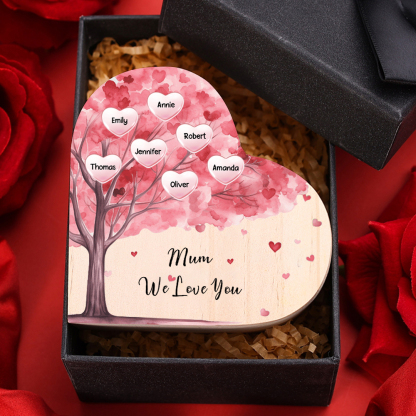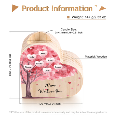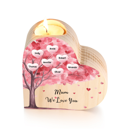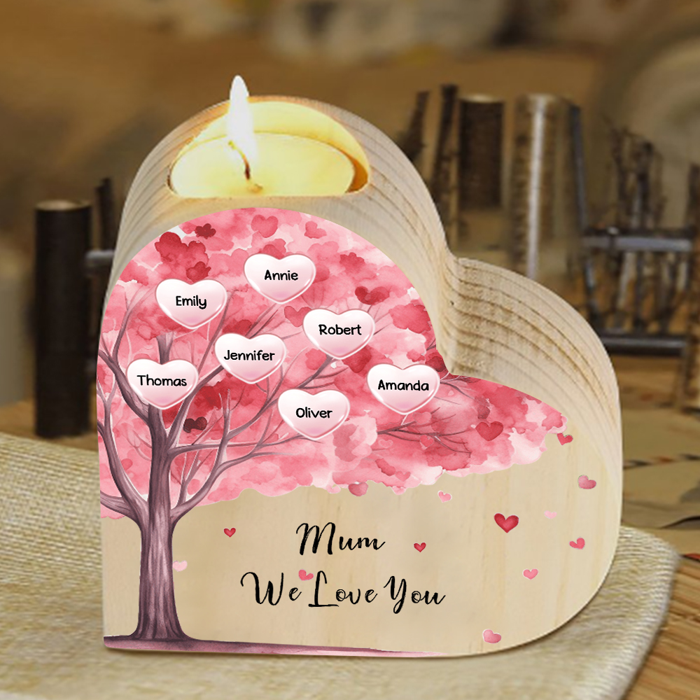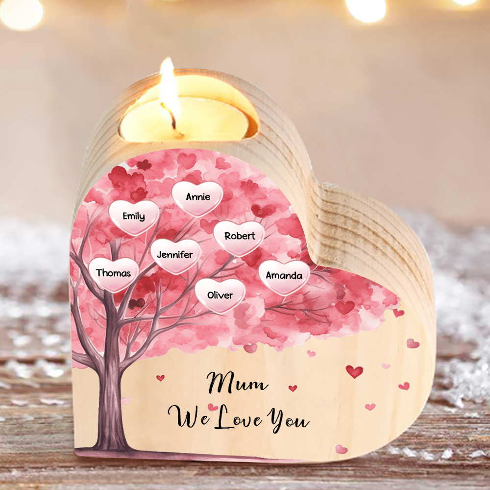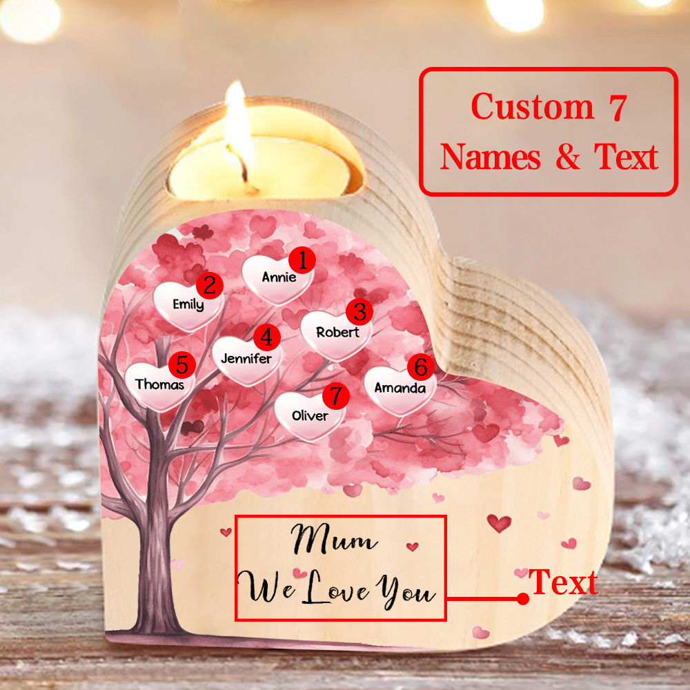 7 Names-Personalized Pink Heart Tree Heart-Shape Candlestick Set With Gift Box Custom Text Mother's Day Gift Wooden Custom Candle Holder For Family