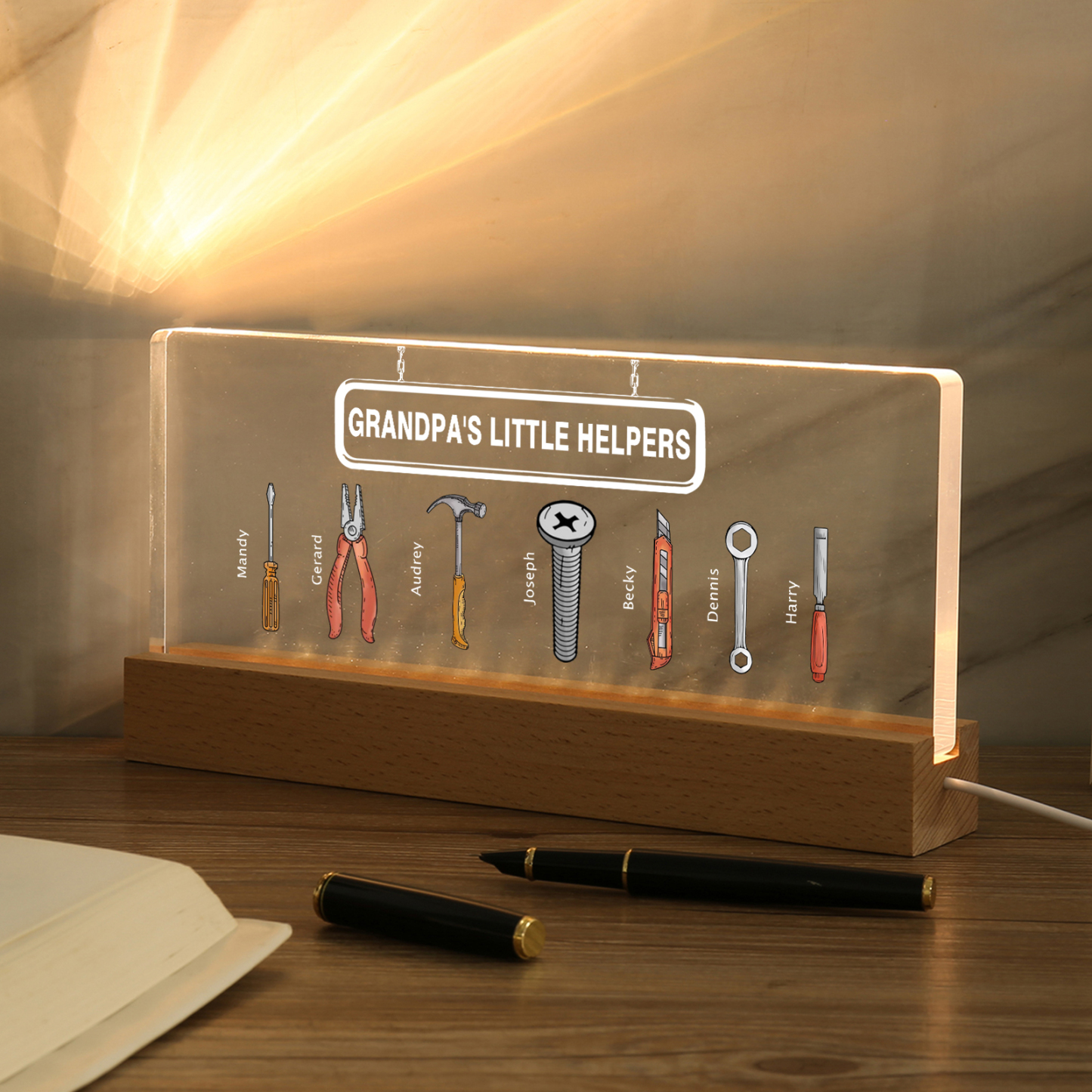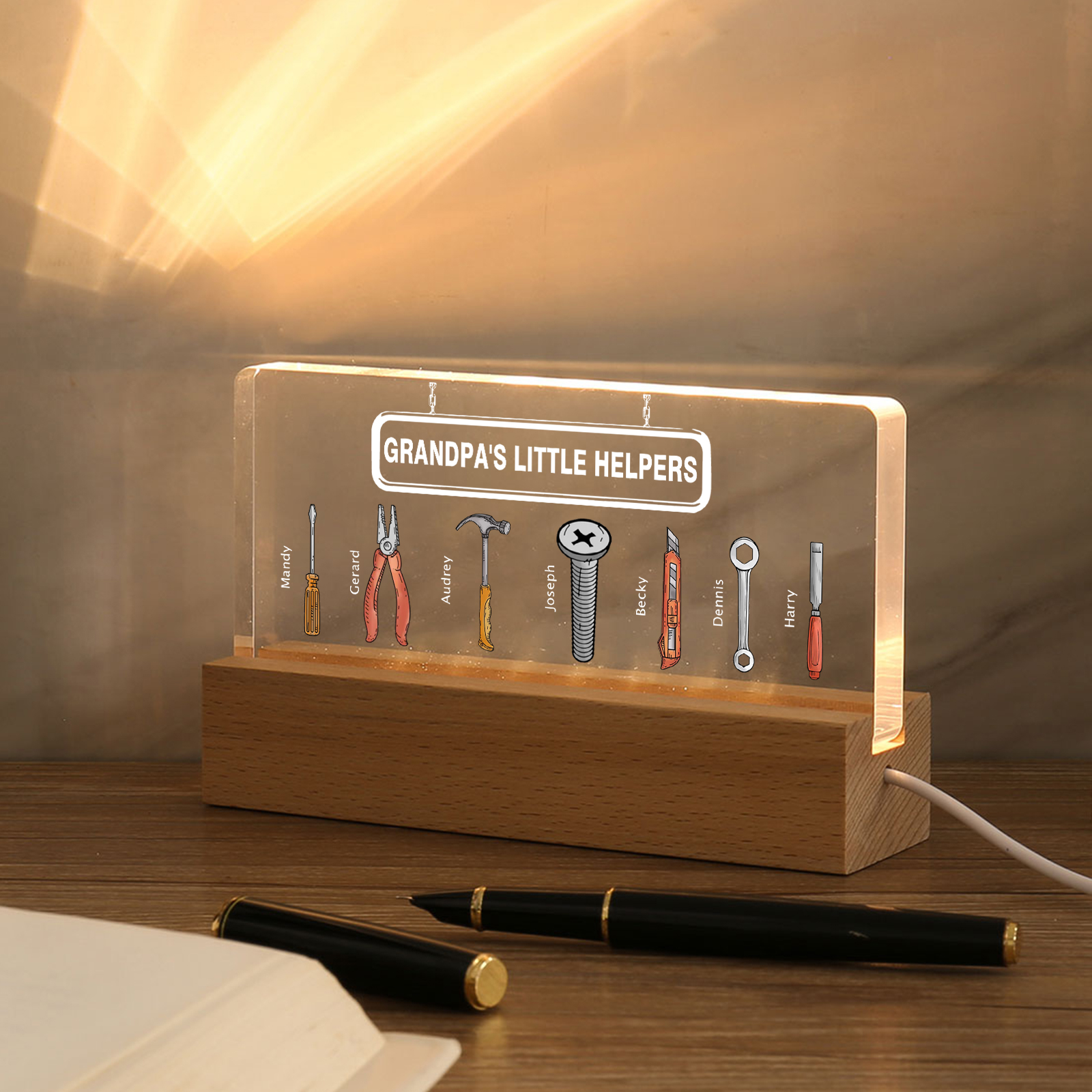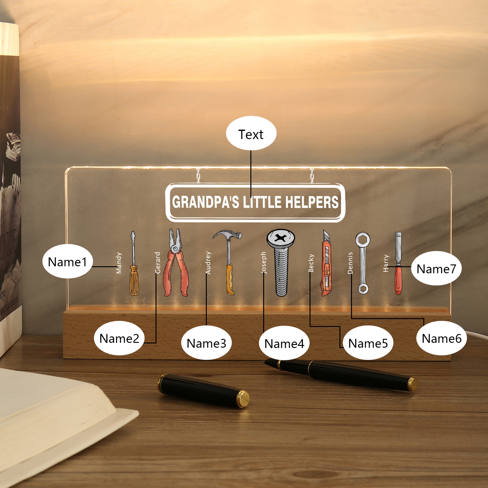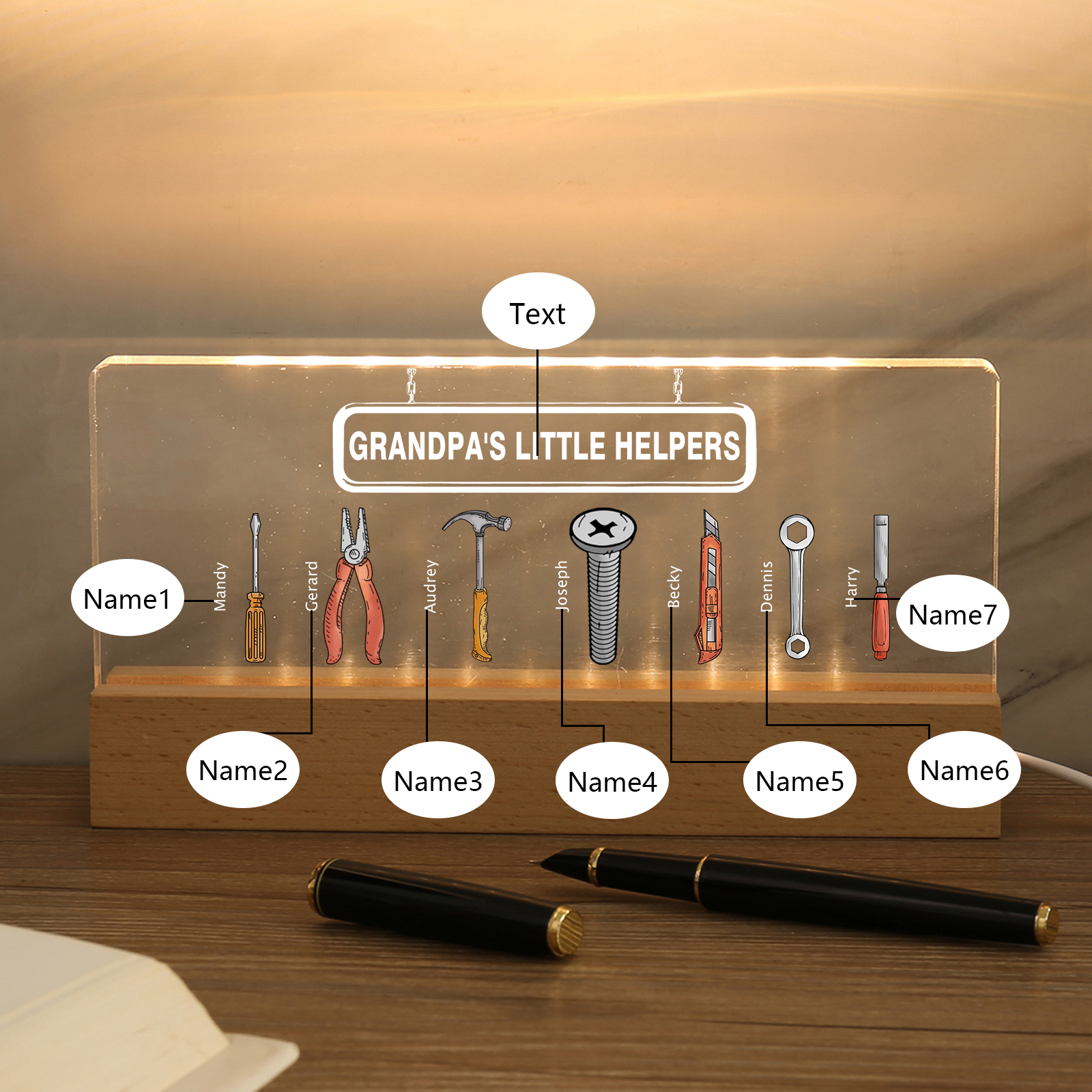 7 Names - Personalized Repair Tool Pattern Table Lamp Customized Text Father's Day Gift for Grandpa/Dad