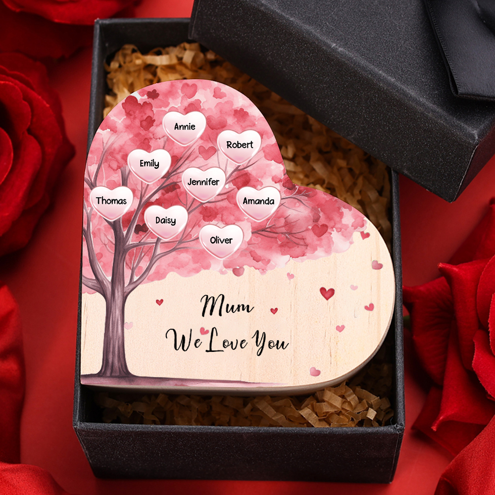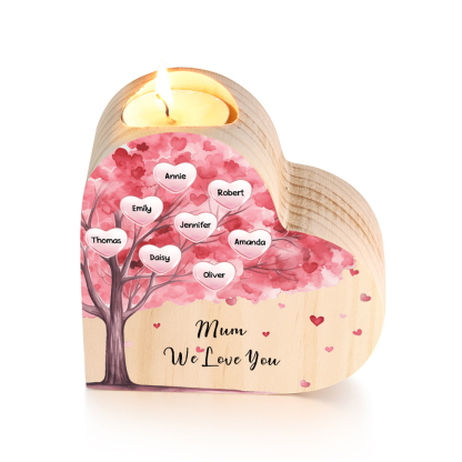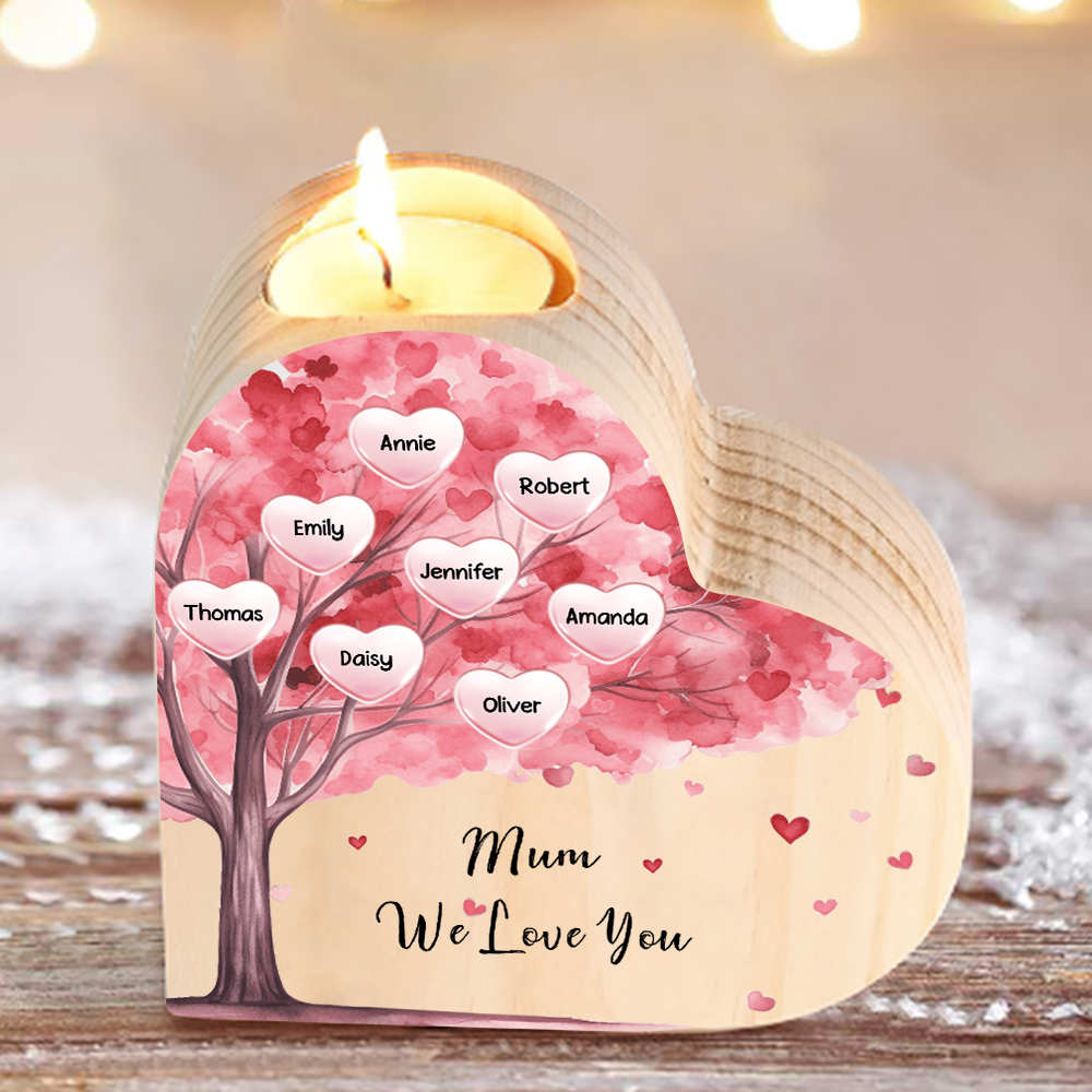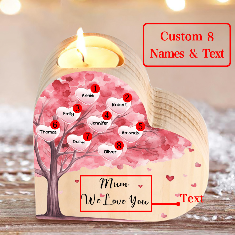 8 Names-Personalized Pink Heart Tree Heart-Shape Candlestick Set With Gift Box Custom Text Mother's Day Gift Wooden Custom Candle Holder For Family