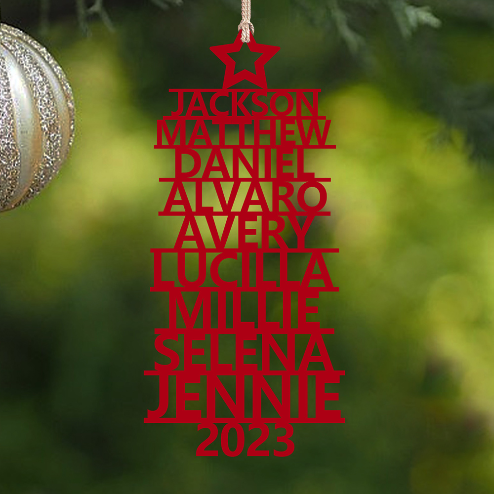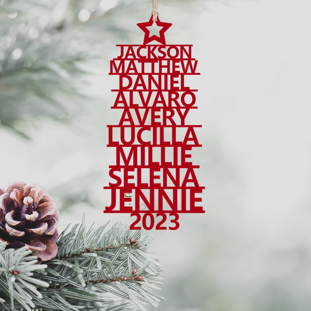 🎁Our customizable Christmas tree ornament, the "Name Tree!" This exquisite ornament allows you to personalize your tree with 2-14 names and a year of your choice. The names elegantly stack upon one another, forming the beautiful shape of a Christmas tree. Choose from three enchanting colors: red, green, and wood.