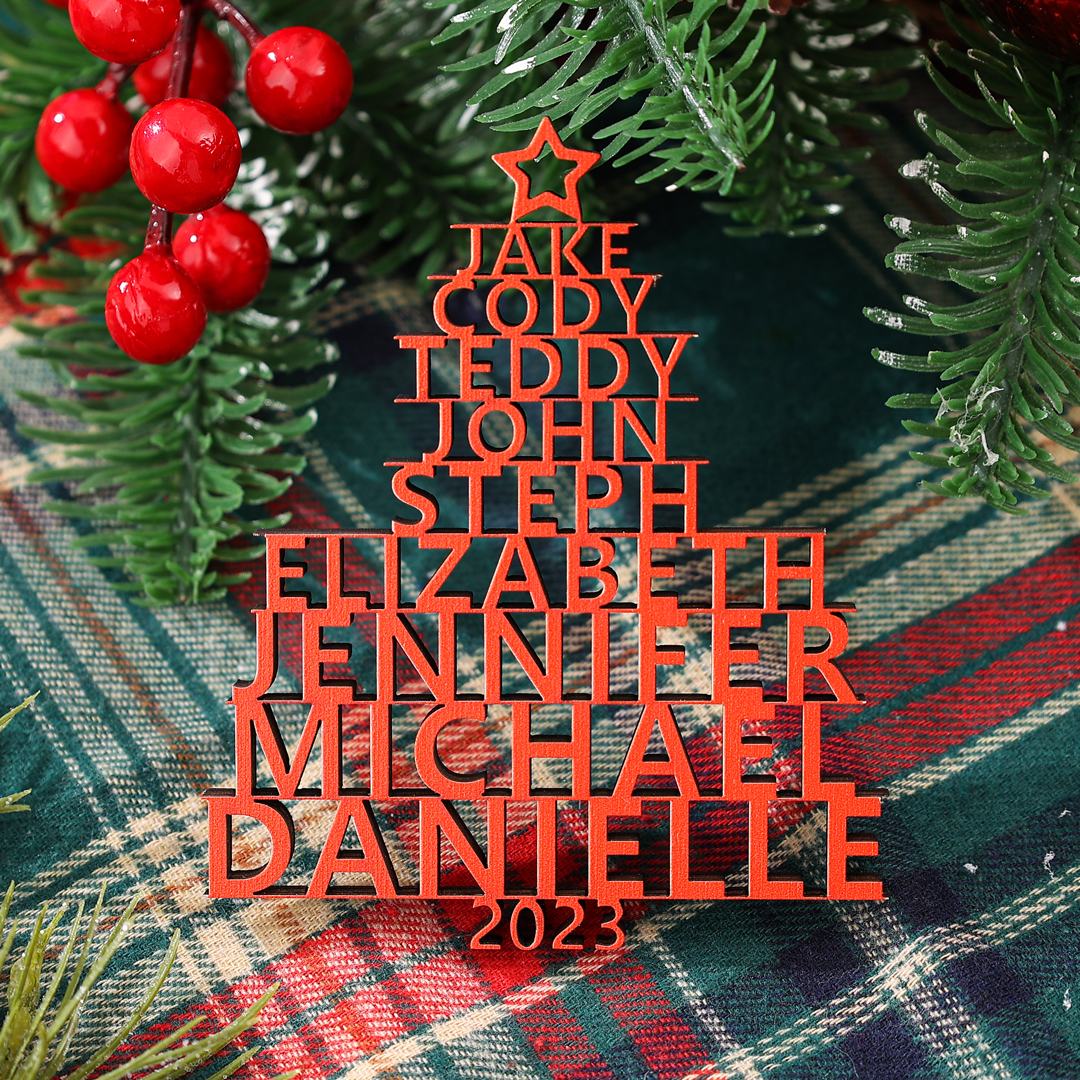 🎁Our customizable Christmas tree ornament, the "Name Tree!" This exquisite ornament allows you to personalize your tree with 2-14 names and a year of your choice. The names elegantly stack upon one another, forming the beautiful shape of a Christmas tree. Choose from three enchanting colors: red, green, and wood.
