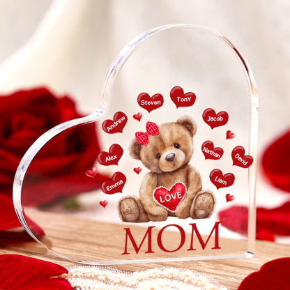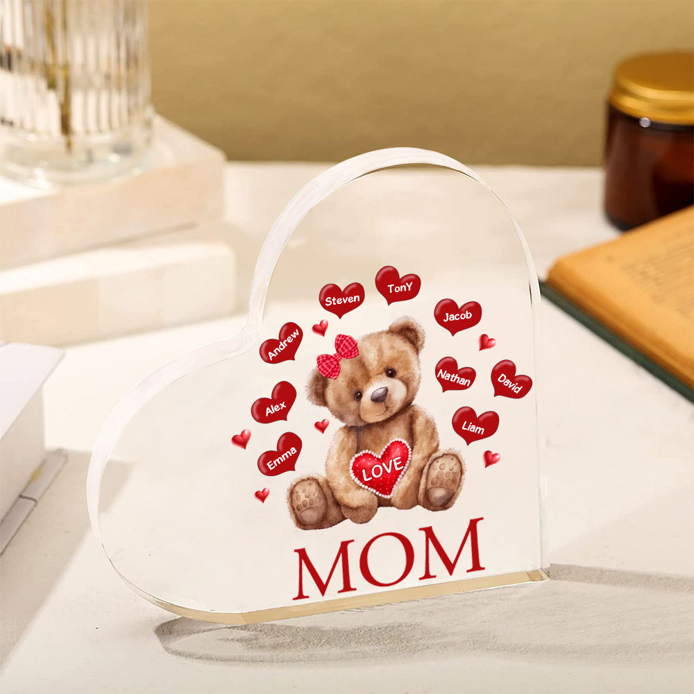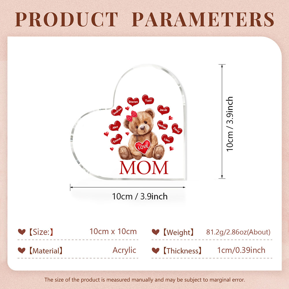 9 Names-Personalized Mom Acrylic Heart Keepsake Custom Text Love Teddy Bear Ornaments Gifts Set With Gift Box for Grandma/Mother