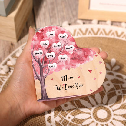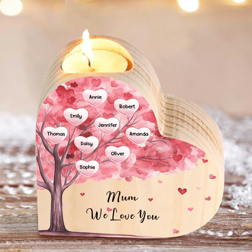 9 Names-Personalized Pink Heart Tree Heart-Shape Candlestick Set With Gift Box Custom Text Mother's Day Gift Wooden Custom Candle Holder For Family