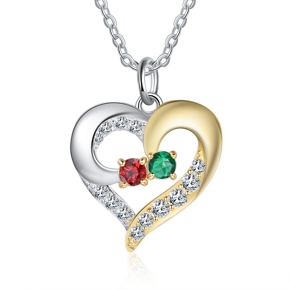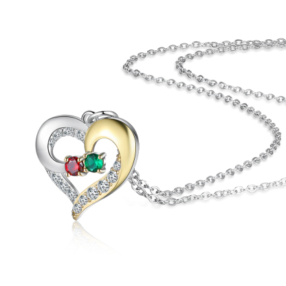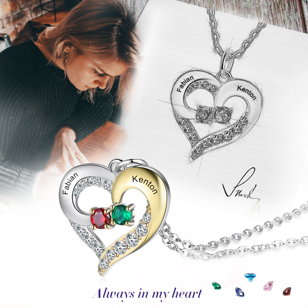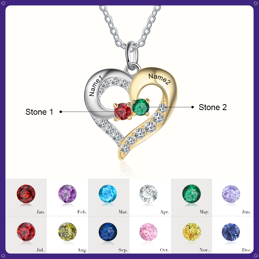 Personalized Heart Necklace With 2 Birthstones Engraved Names Gift For Women