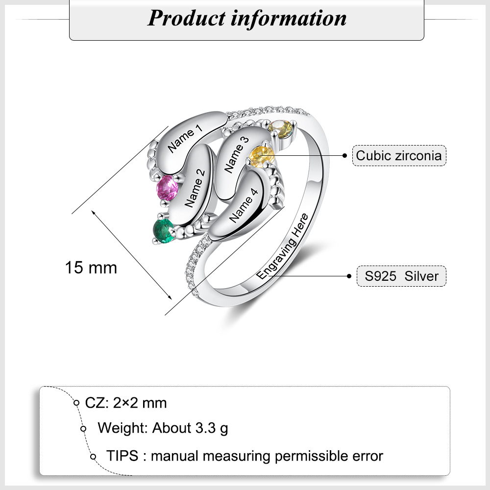 Personalized Baby Foot Ring With 4 Birthstones Engraved Names Ring Gift For Women