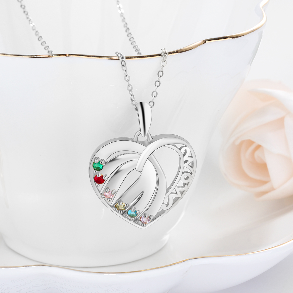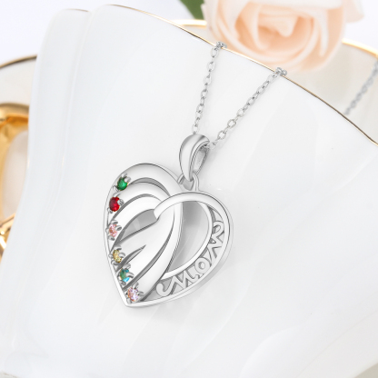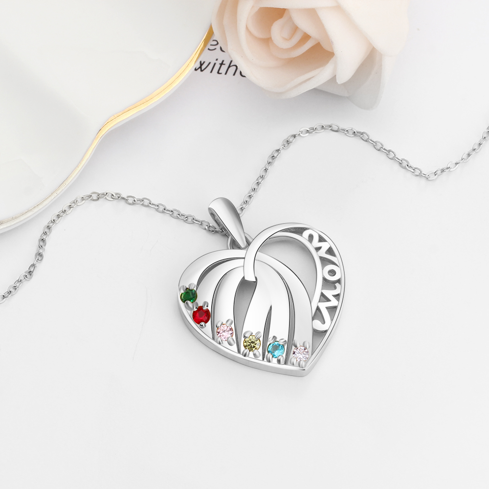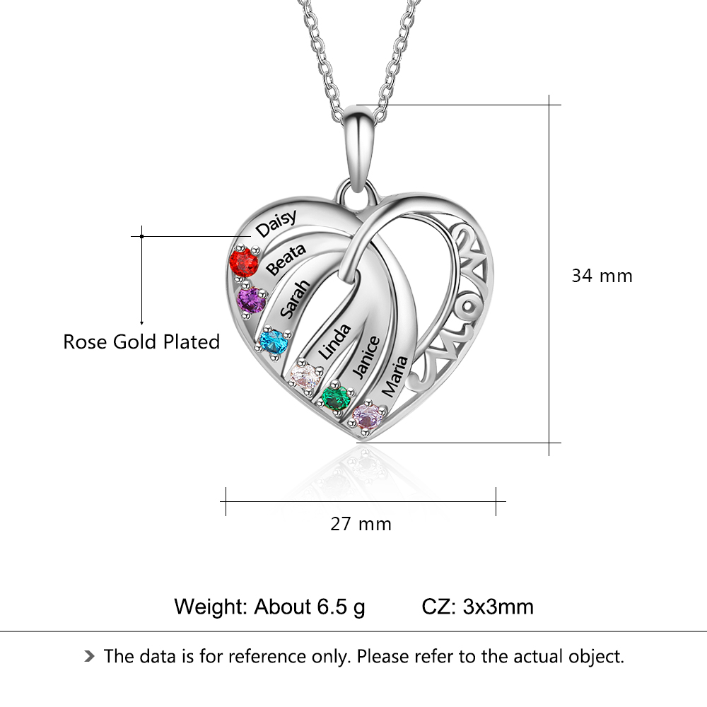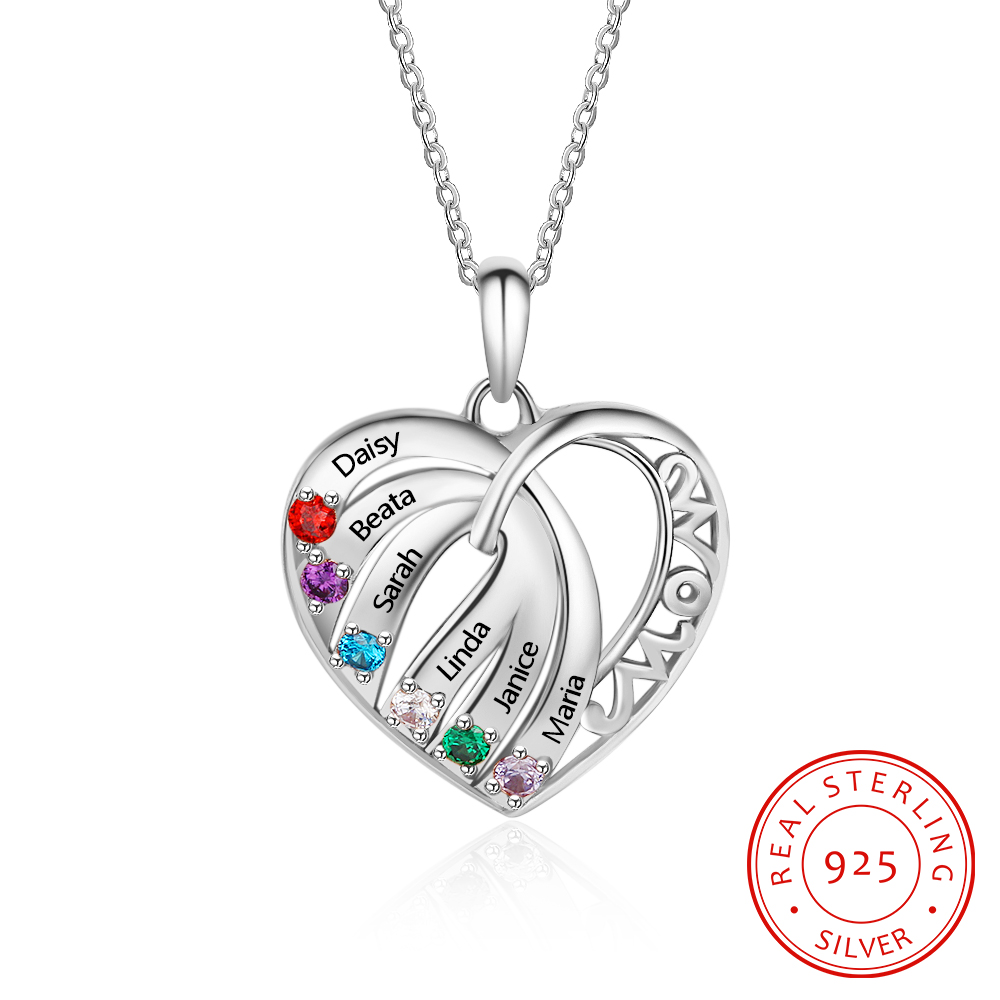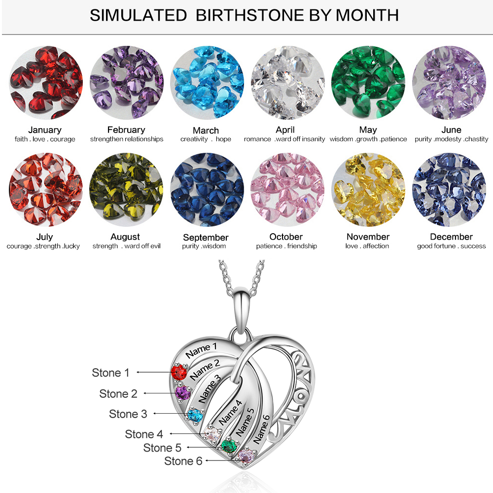 Personalized Heart Necklace With 6 Birthstones Engraved Names Gift For Her
