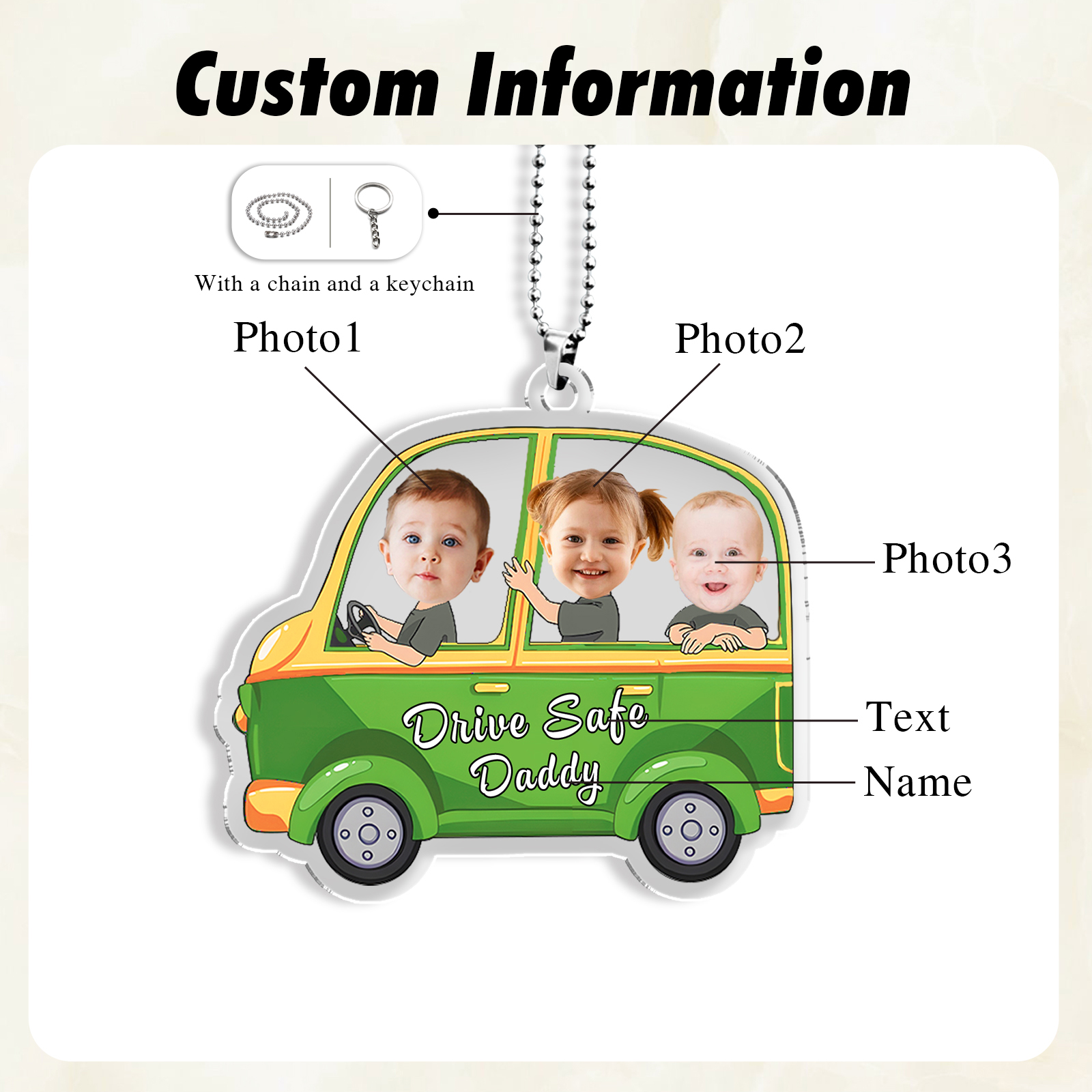 Acrylic Keychain/Decoration Personalized 3 Photo, Name And Text Child Driving Pattern Pendant For Dad