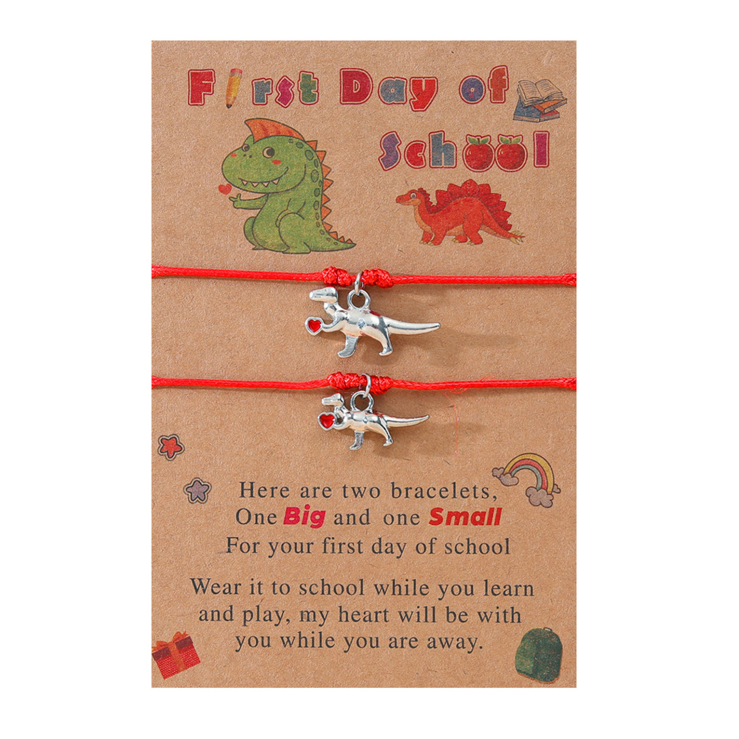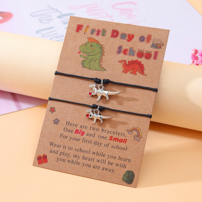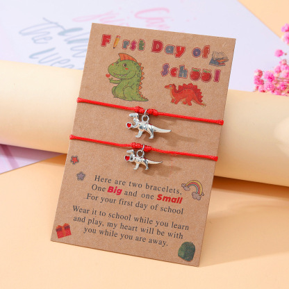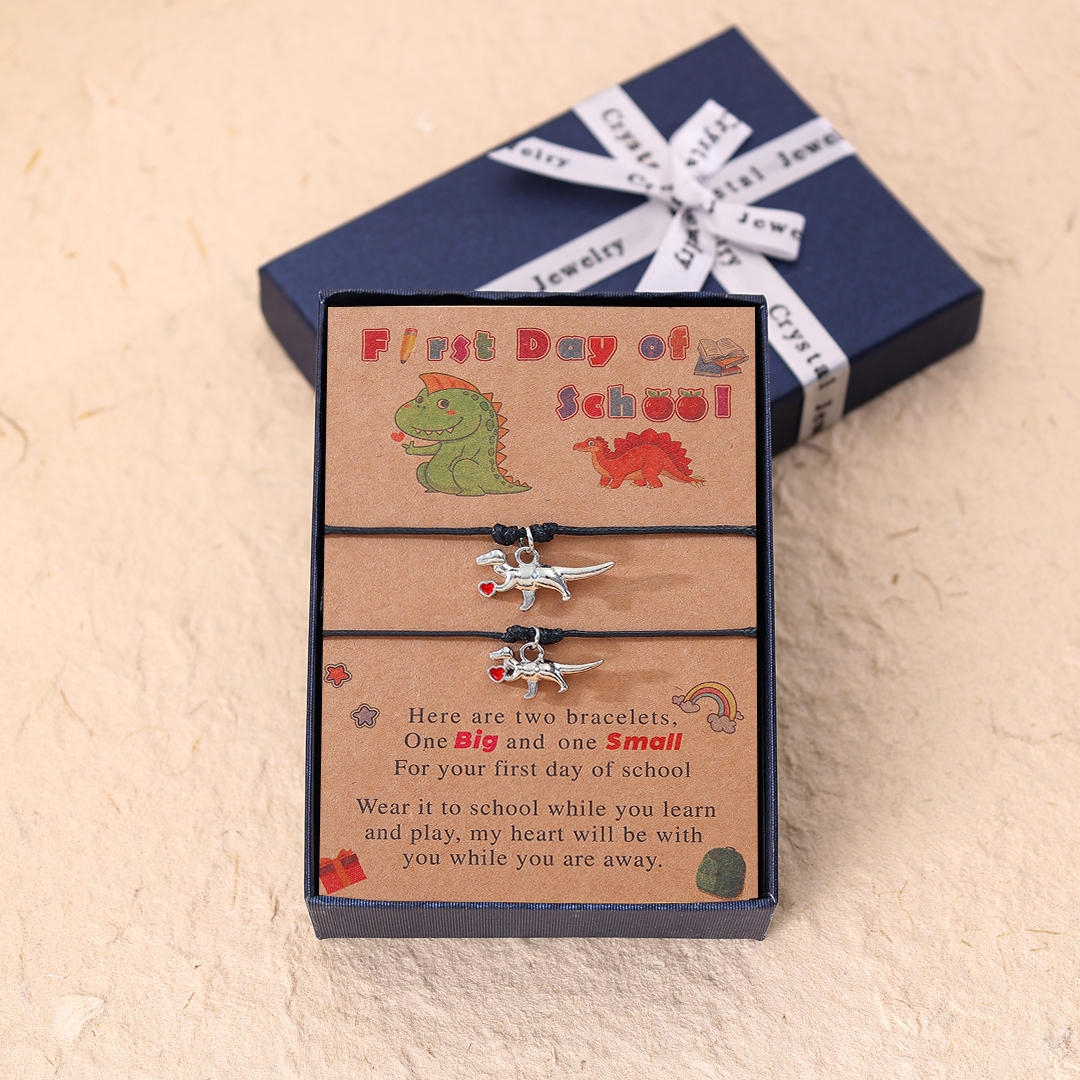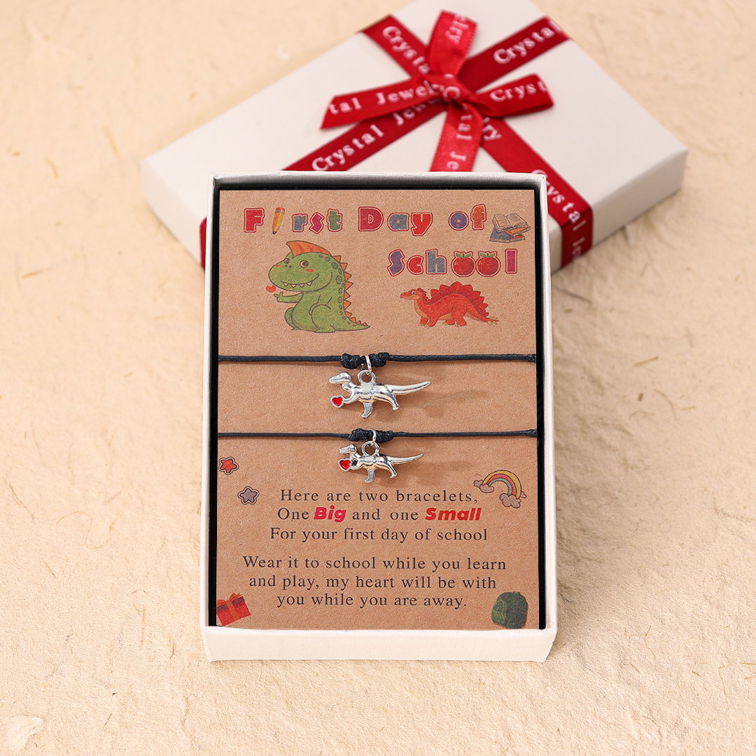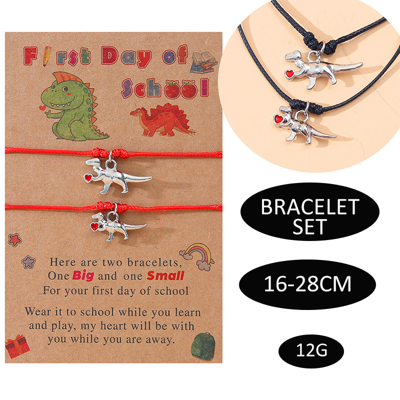 Each bracelet features a cute dinosaur charm, symbolizing strength and courage as they embark on their educational journey. Available in classic black and vibrant red colors, these bracelets are designed to suit varying tastes and styles.