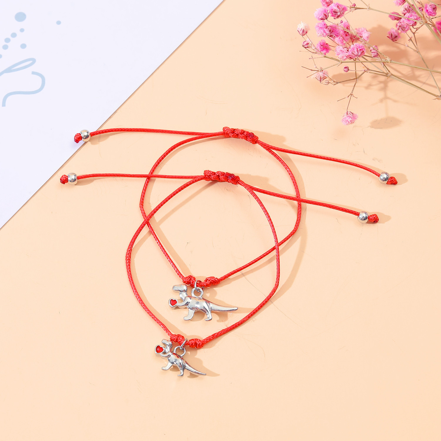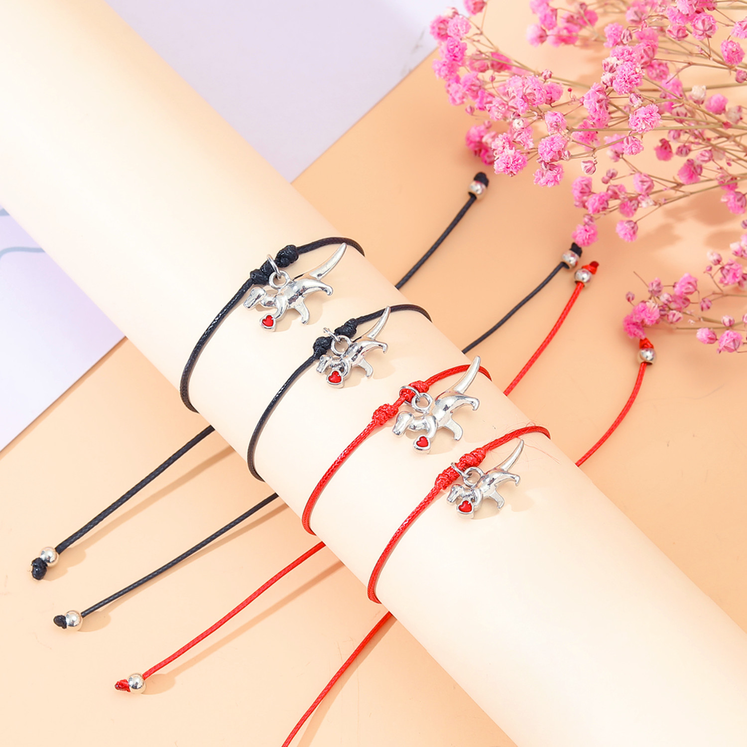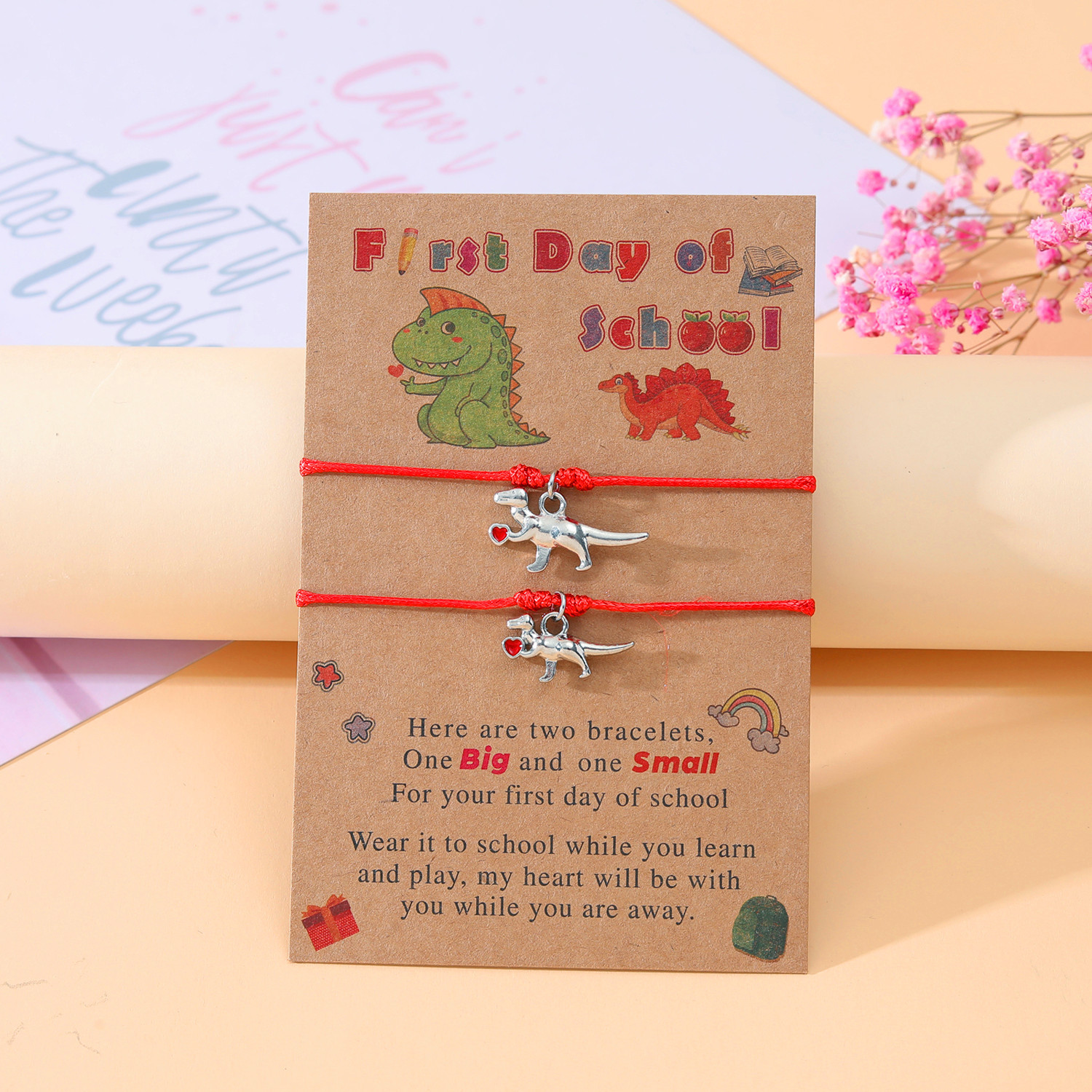 Each bracelet features a cute dinosaur charm, symbolizing strength and courage as they embark on their educational journey. Available in classic black and vibrant red colors, these bracelets are designed to suit varying tastes and styles.
