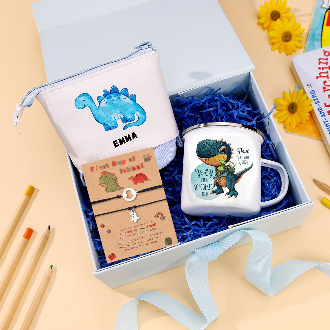 Back to School Gift Set -Personalized Gift Customized Name and Date Enamel Mug and Blue Dinosaur Pencil Case and Dinosaur Bracelet Set - Gift for Kids