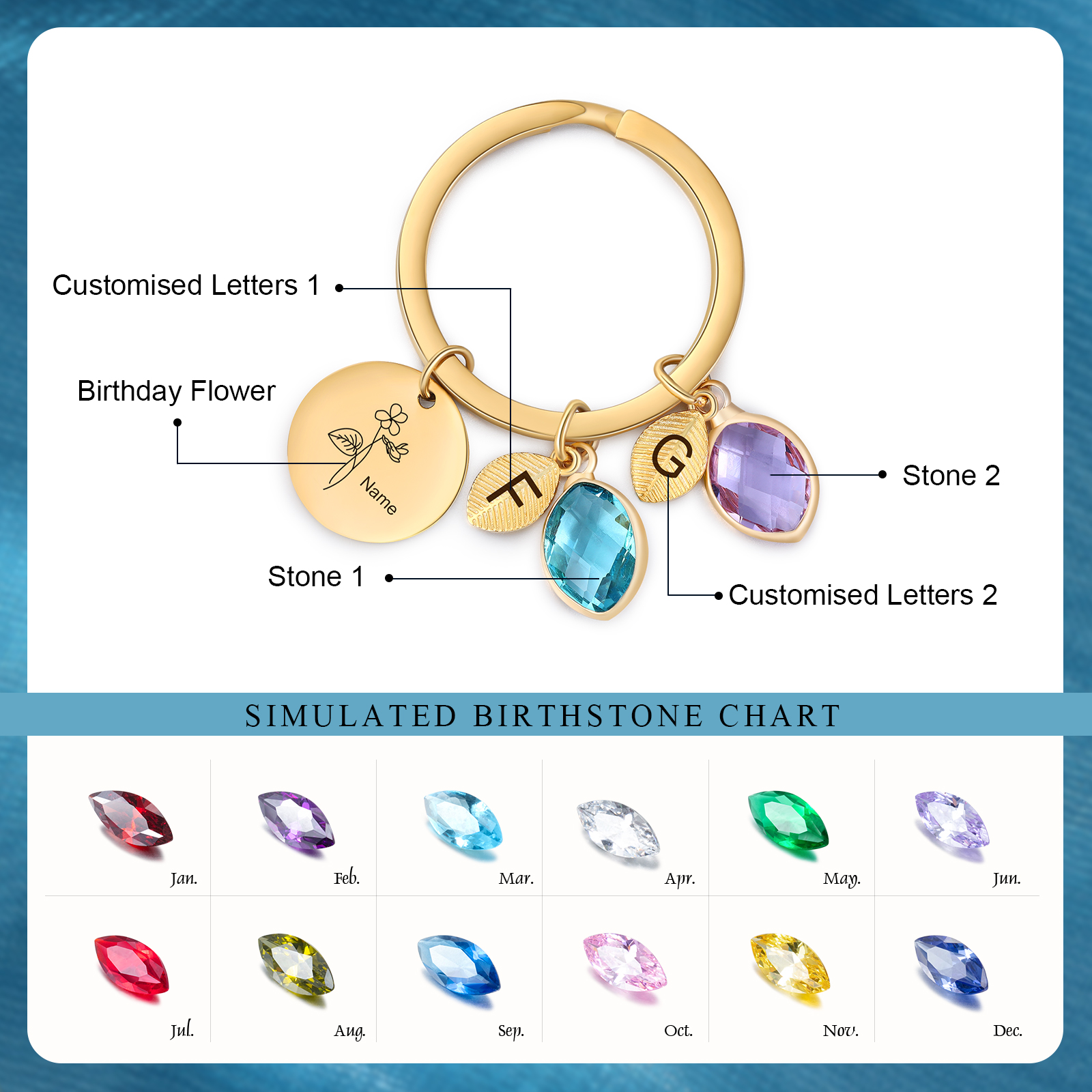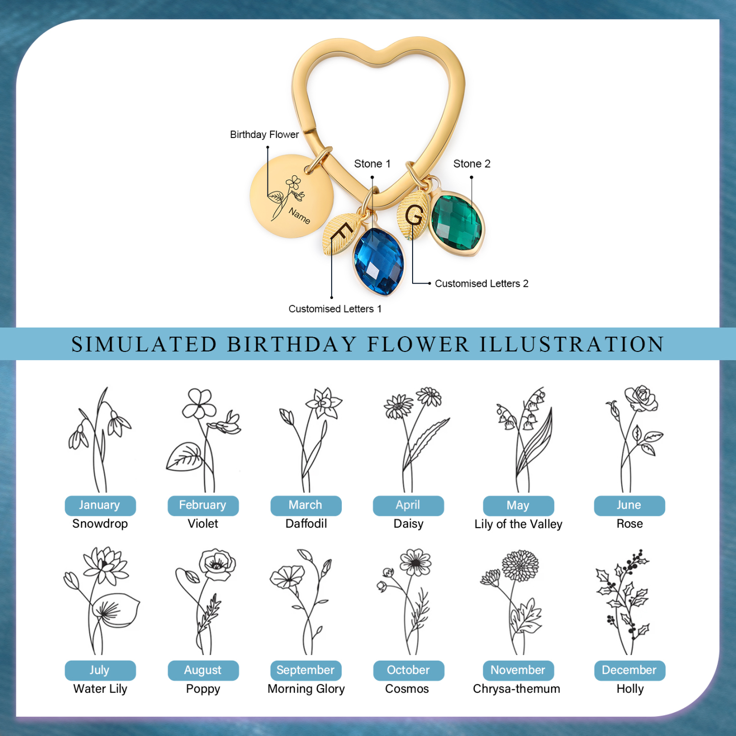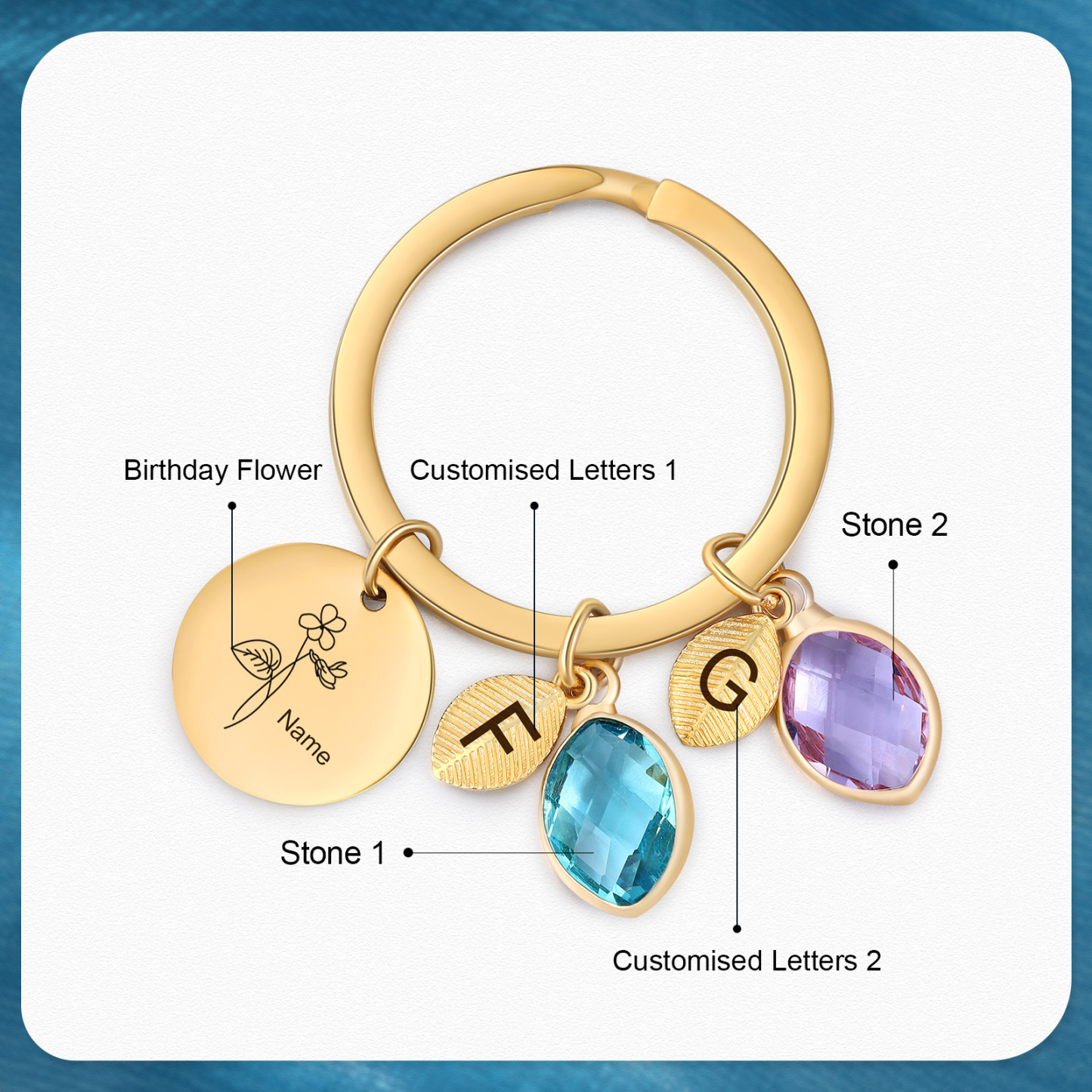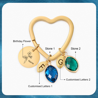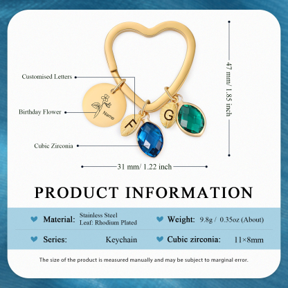 This keychain allows you to design your name,birthday flower, letters and choose your birthstone.