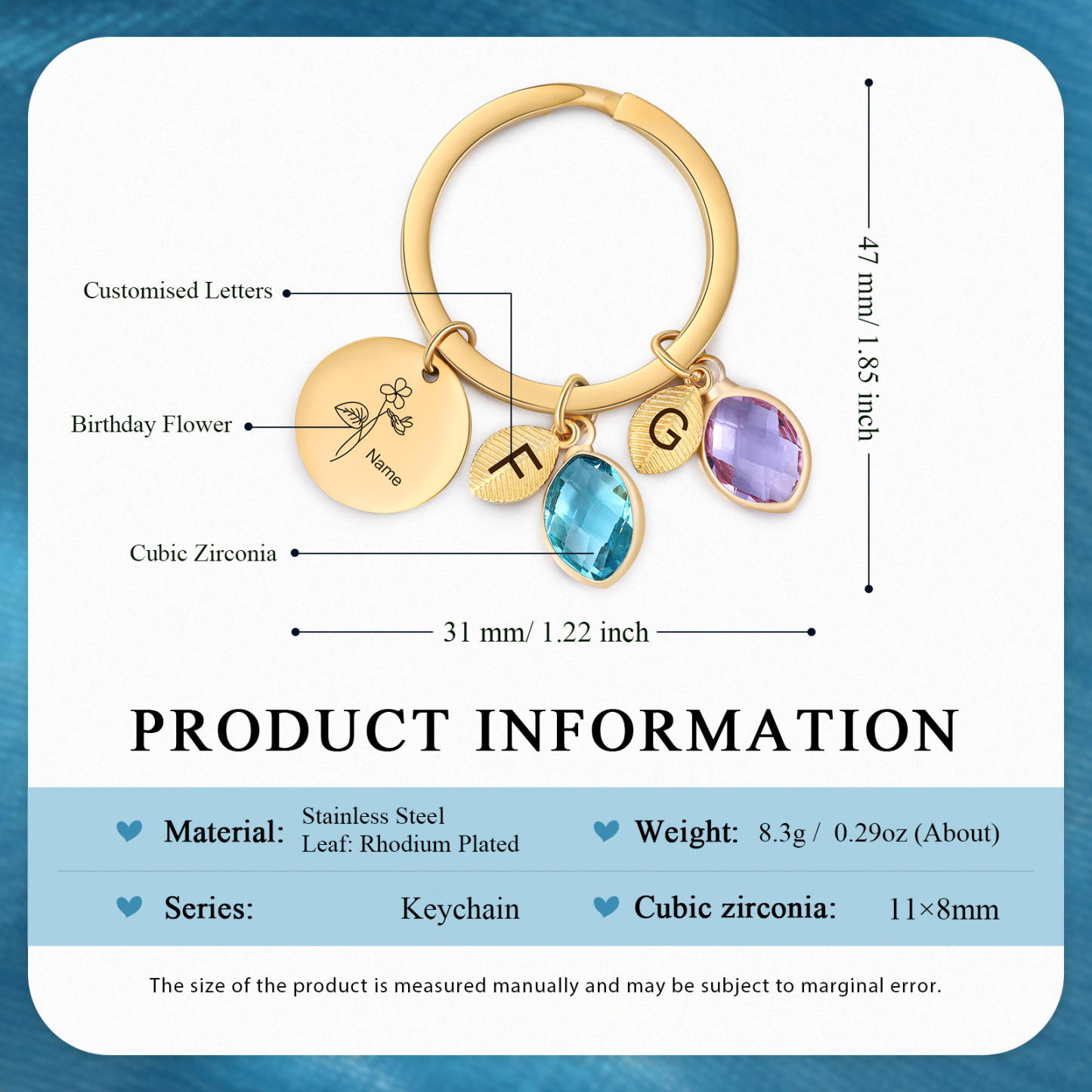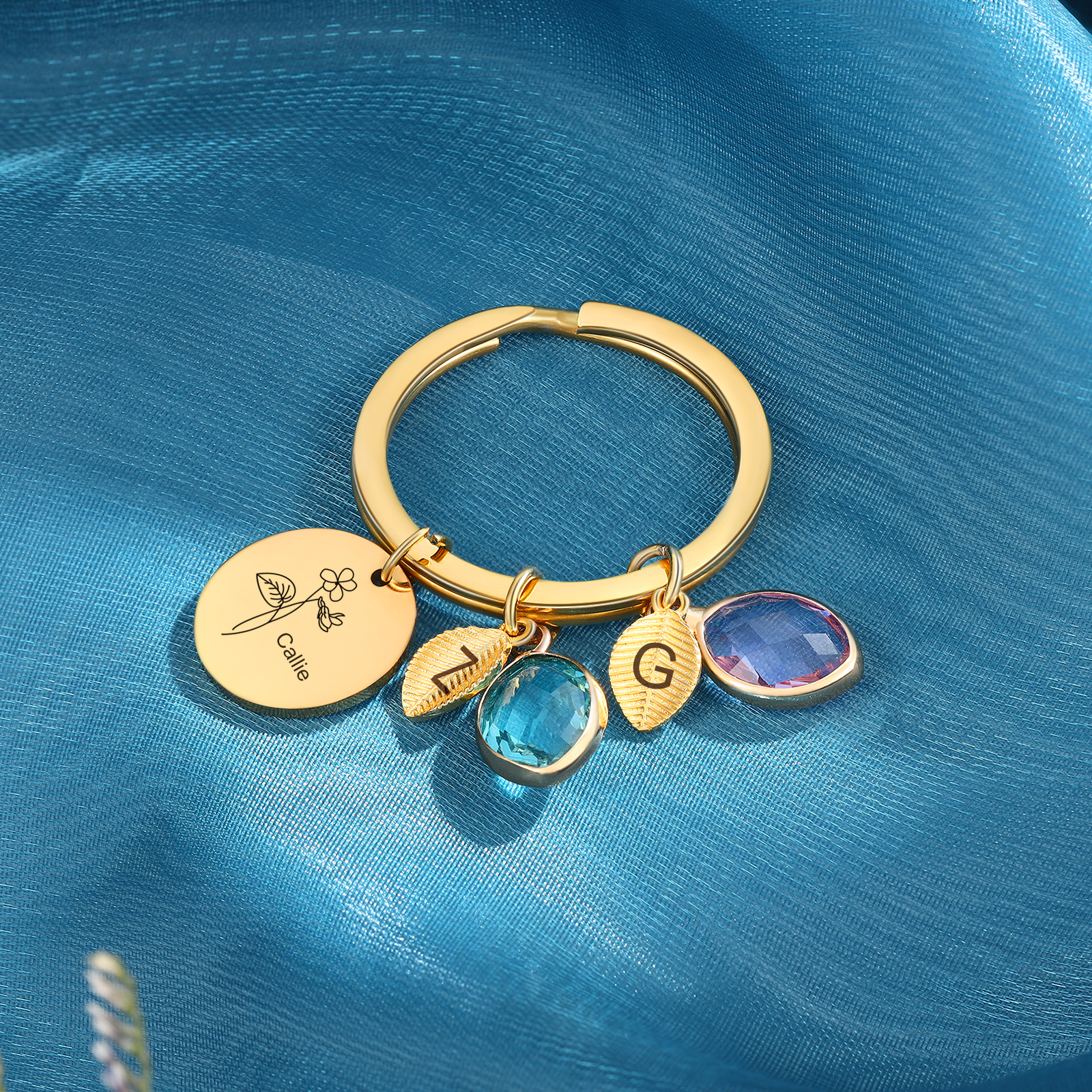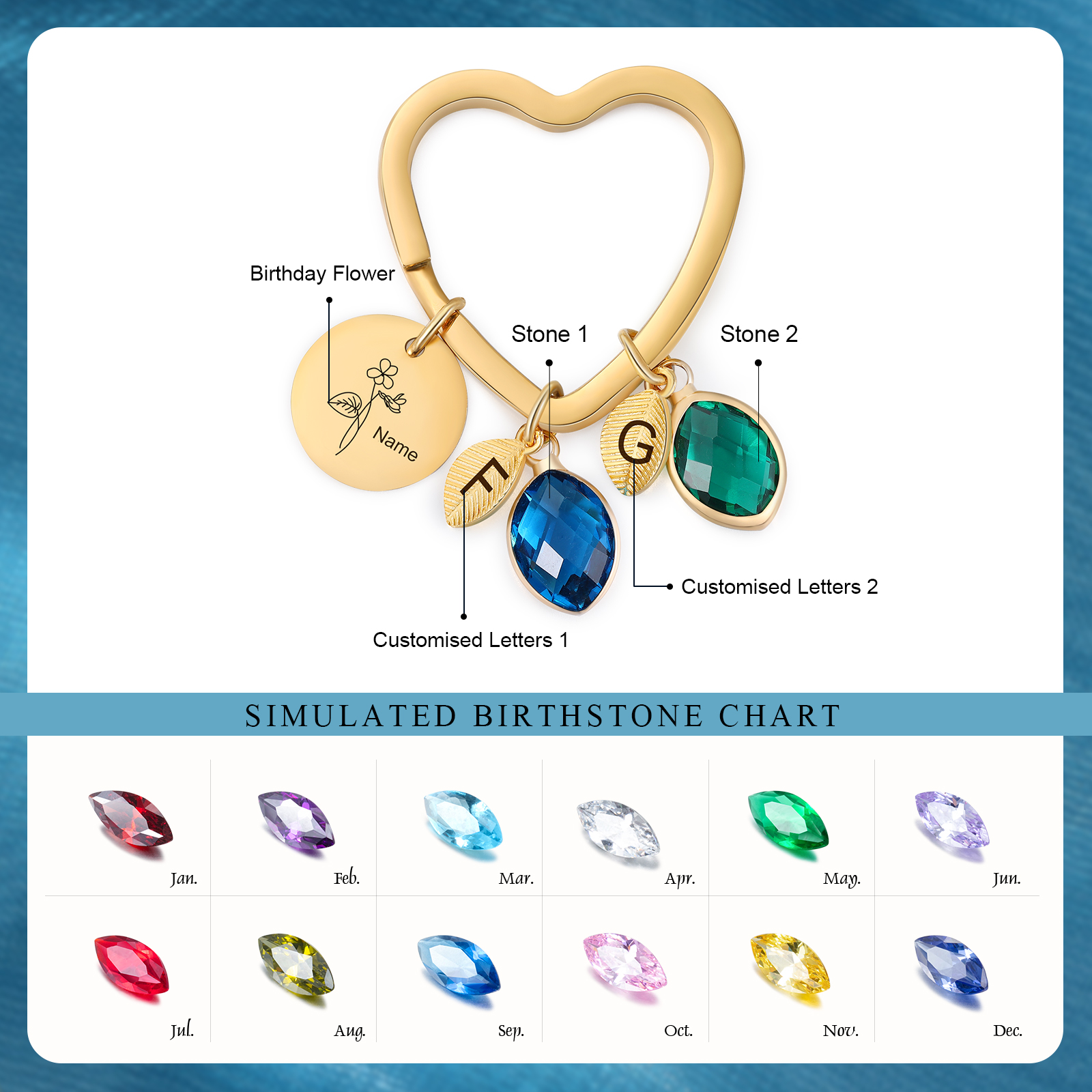 This keychain allows you to design your name,birthday flower, letters and choose your birthstone.