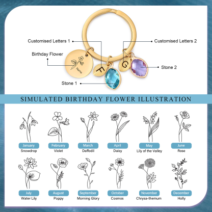 Birthday Flower Personalized Pendant Design 2 Letter Birthstone Keychain Mom Hook Engraving Special Gift for Mom