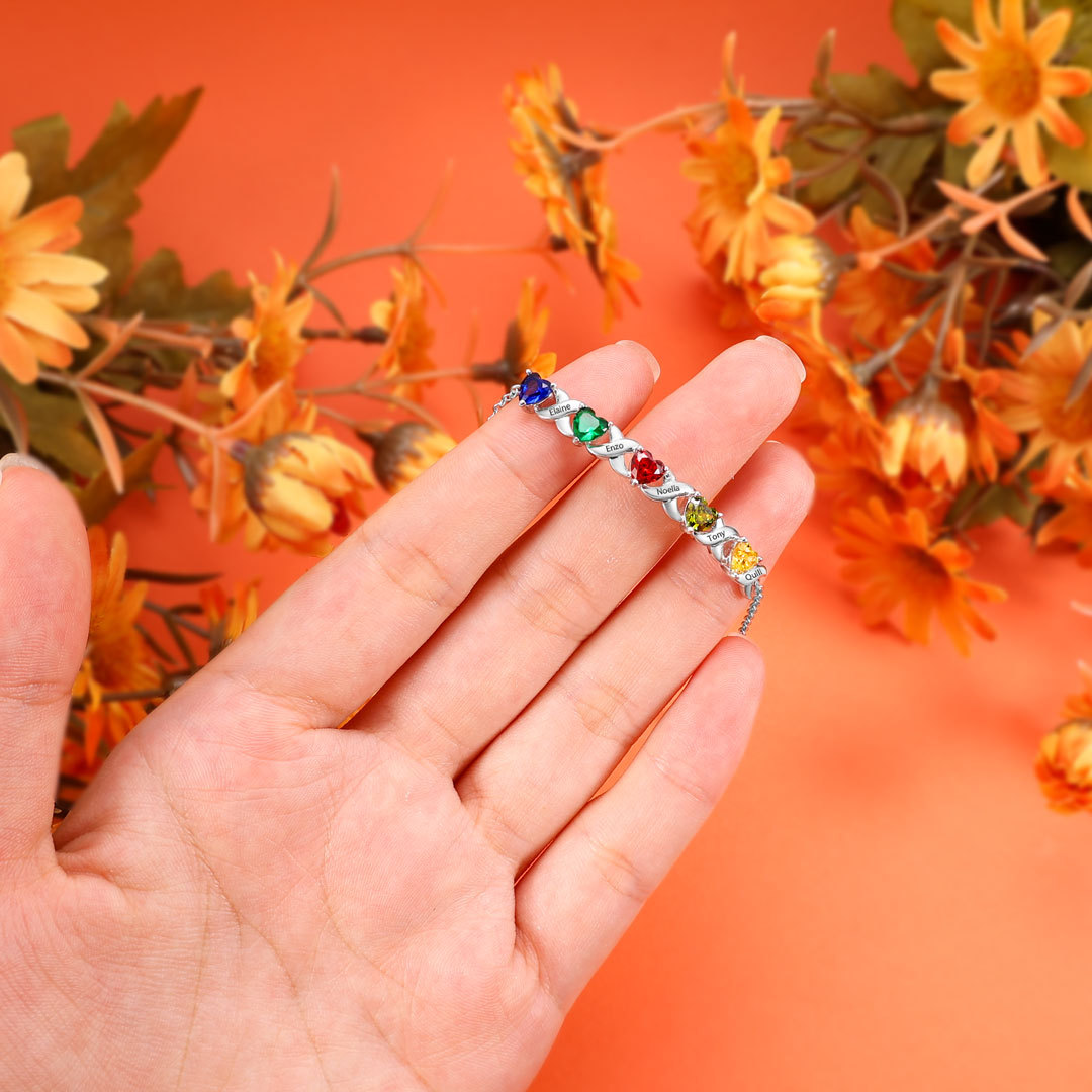 Personalized Bracelet With 5 Heart Birthstones Engraved Names Bracelet Gift For Women