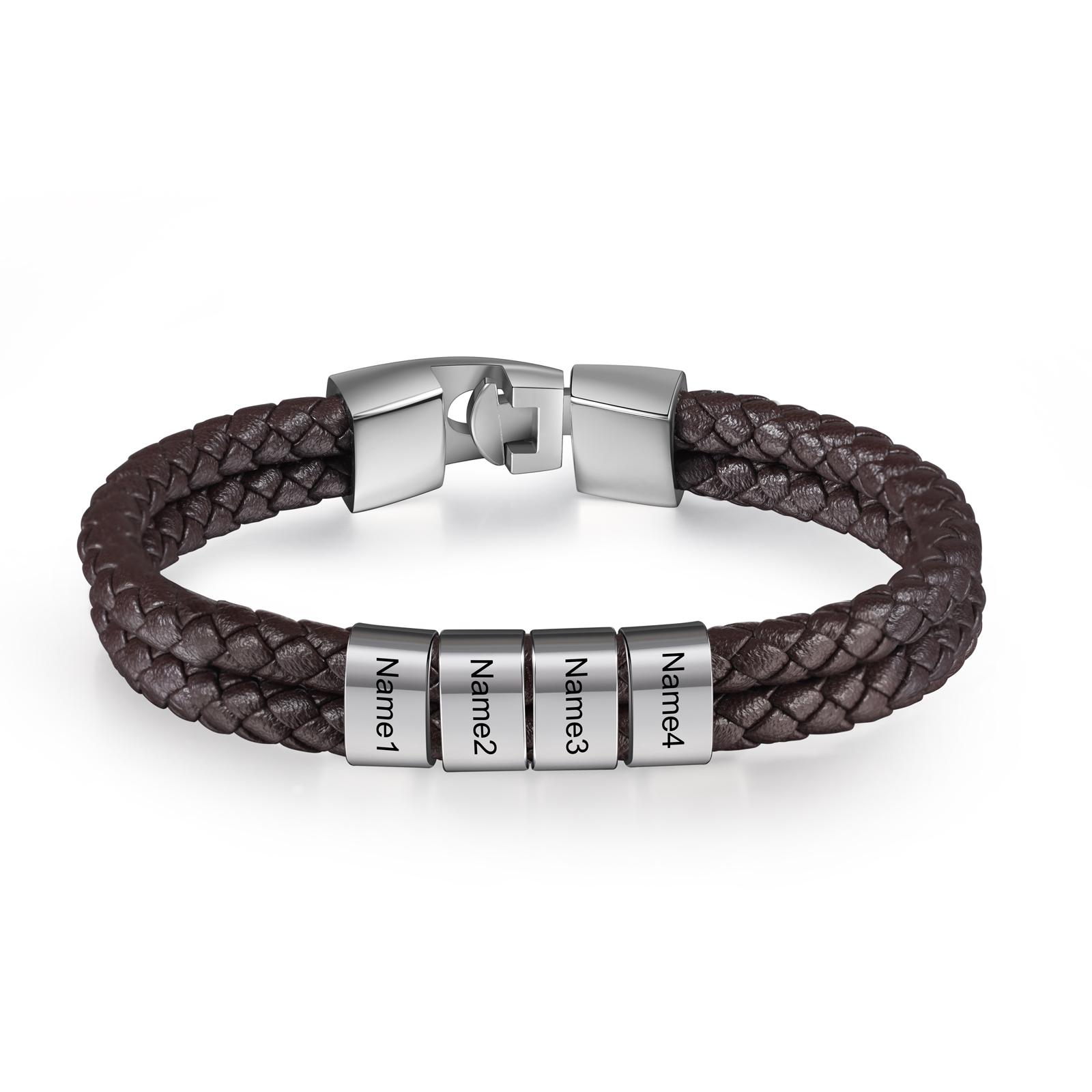 Brown Personalized Double Layered Braided Leather Bracelet Engraved 4 Names Mens Bracelet for Him