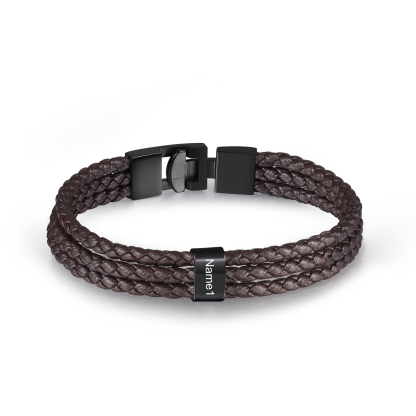 Brown Personalized Three Layered Braided Leather Bracelet Engraved 1 Name Mens Bracelet for Him