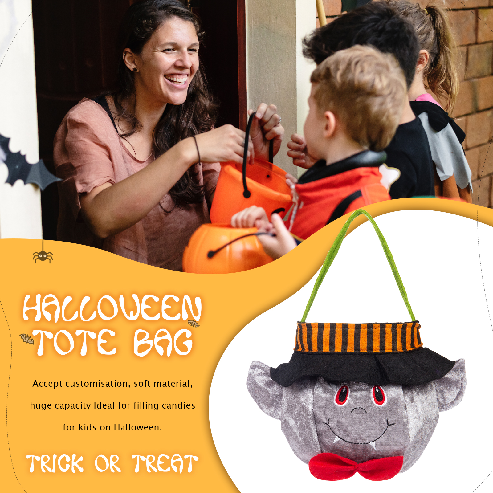 🎃Introducing our latest Halloween Candy Bag, now available with customizable names! This spooktacular candy bag is the perfect accessory for trick-or-treating and Halloween parties. Made from durable materials, it ensures your candies stay safe and secure throughout the night.
