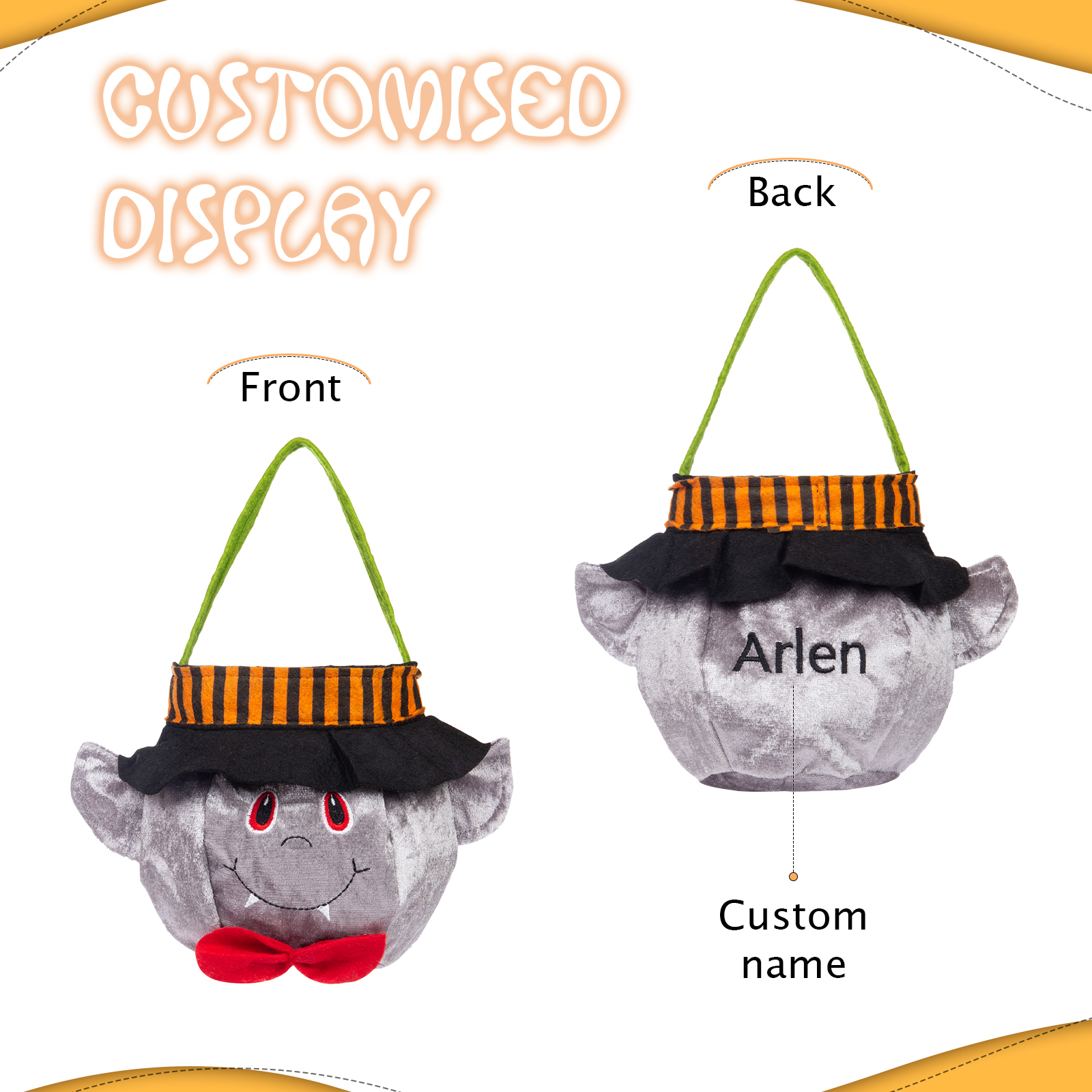 With our unique customization option, you can add your desired name to make this candy bag truly one-of-a-kind. Whether it's your own name, a spooky moniker, or a fun nickname, personalizing your candy bag adds an extra touch of Halloween magic.