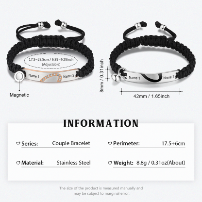 🌟 The set includes two bracelets, each adorned with an infinity symbol and customizable with 2 names of your choice. You can add your and your partner's names to make these bracelets a unique and meaningful gift, emphasizing your special connection.