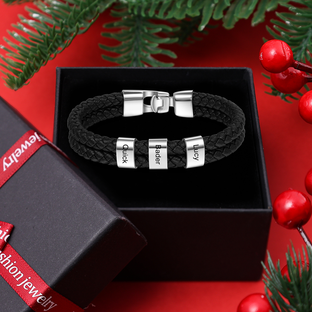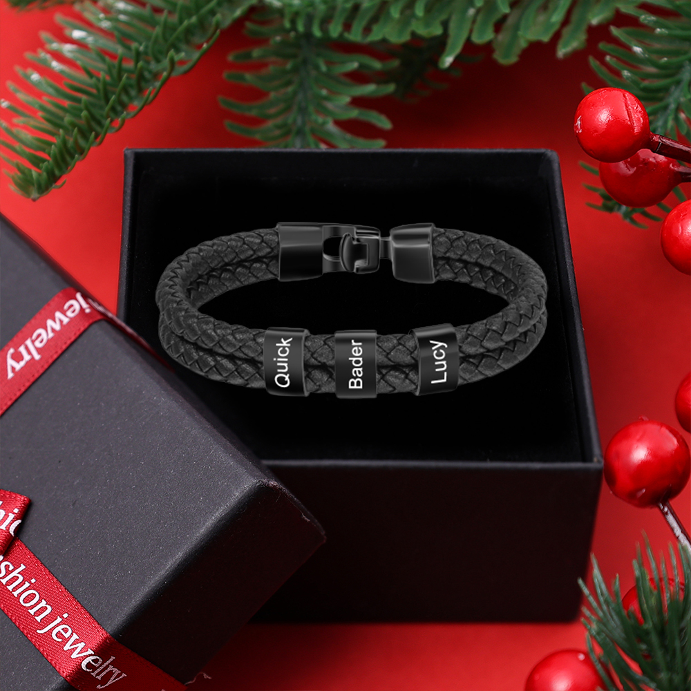3 Names-Personalized Braided Leather Bracelet Set With Gift Box-Custom Men's Bracelet Engraved 3 Names for Him