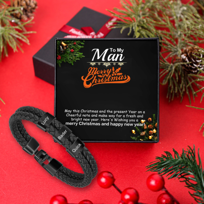 3 Names-Personalized Braided Leather Bracelet Set With Gift Box-Custom Men's Bracelet Engraved 3 Names for Him