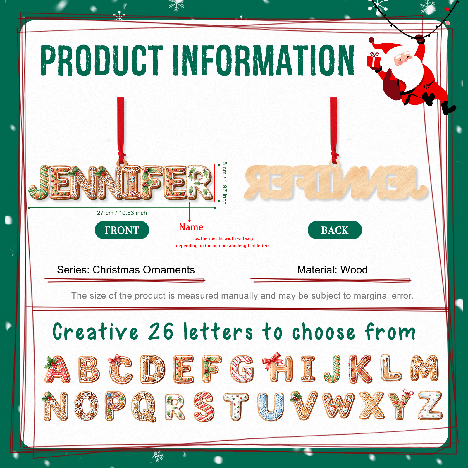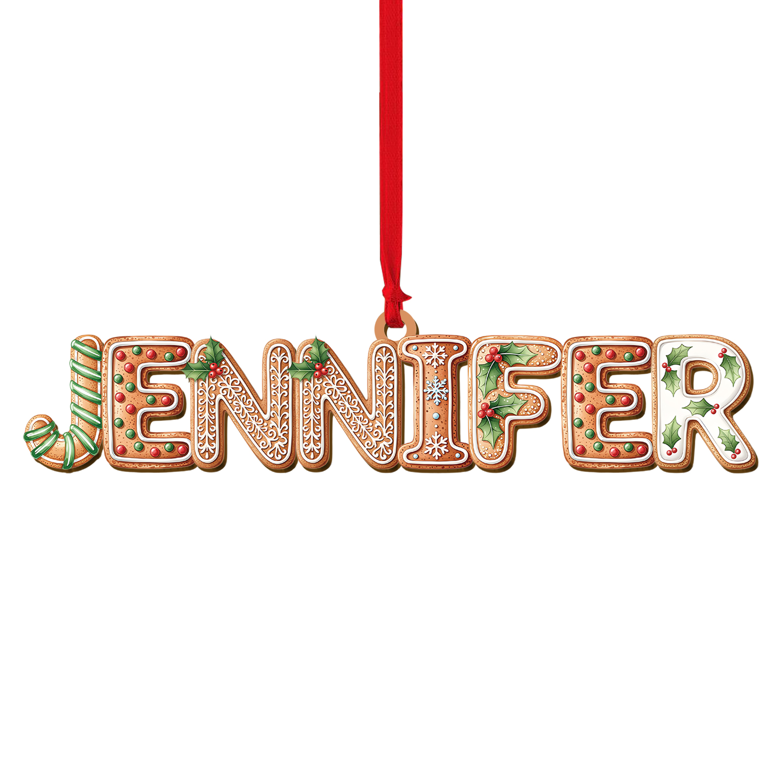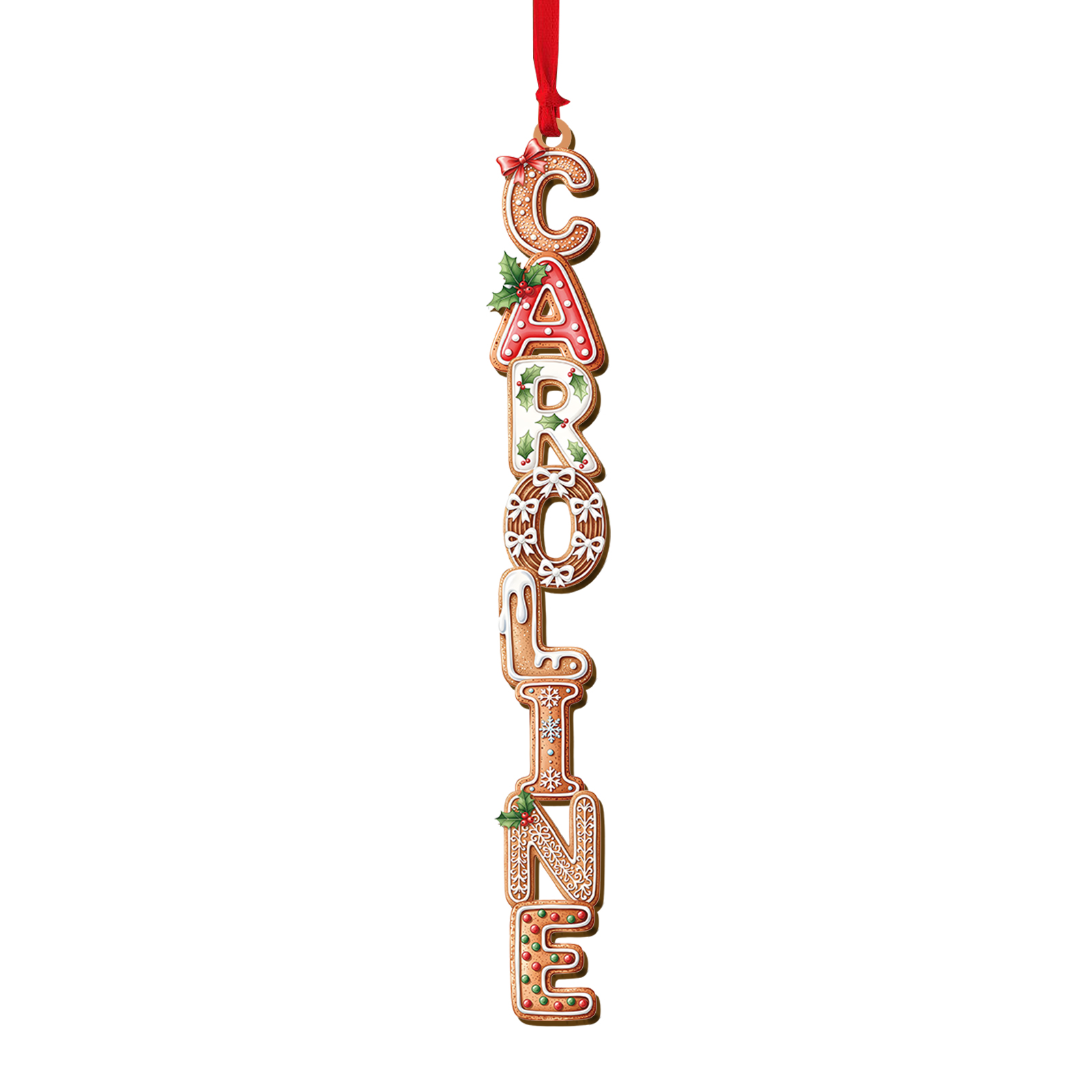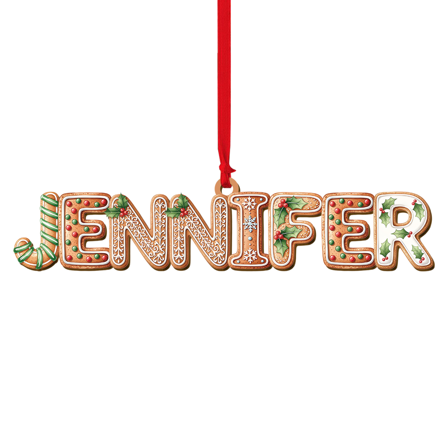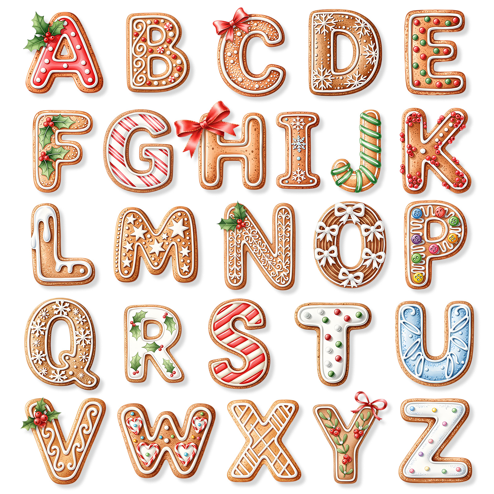 - Custom name spelled in cookie-inspired letters with holly and icing motifs (26 letters A–Z)