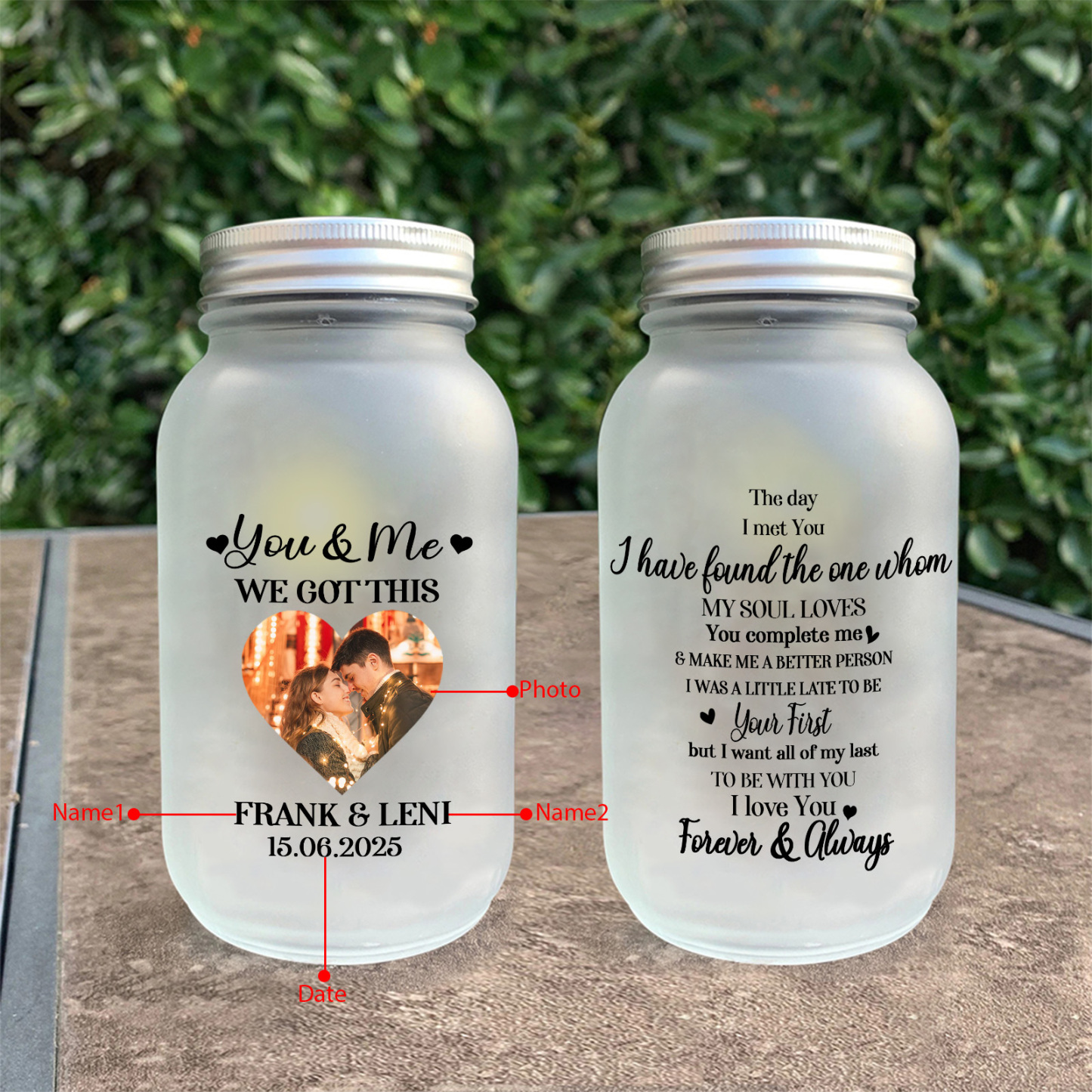 - Romantic frosted glass jar with custom names, date, and heart‑shaped photo