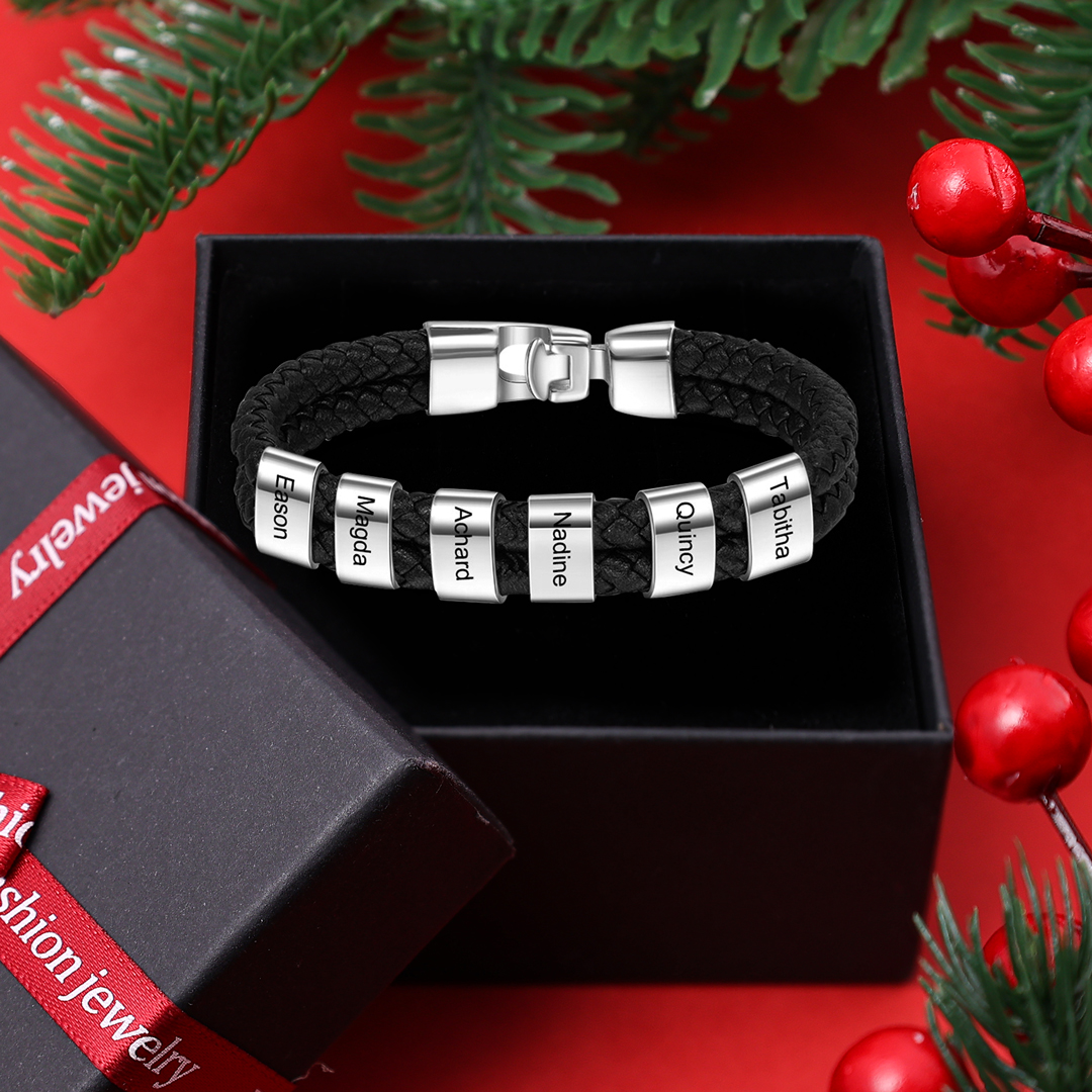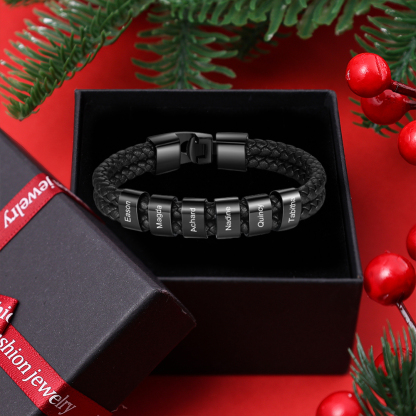 6 Names-Personalized Braided Leather Bracelet Set With Gift Box-Custom Men's Bracelet Engraved 6 Names for Him