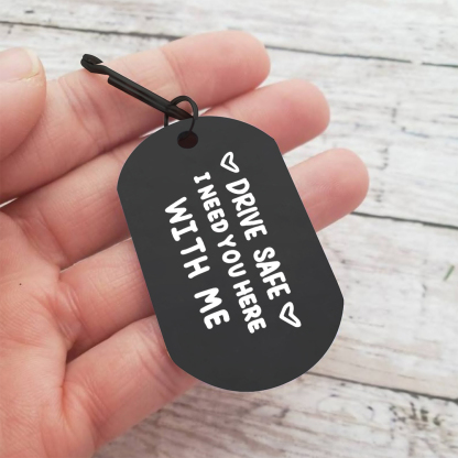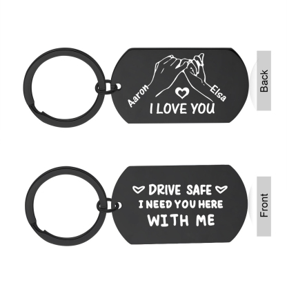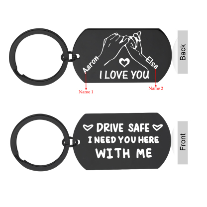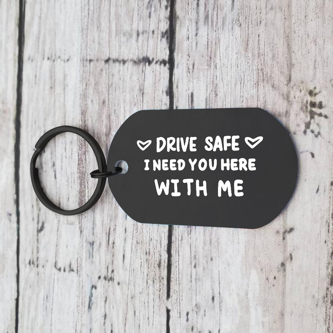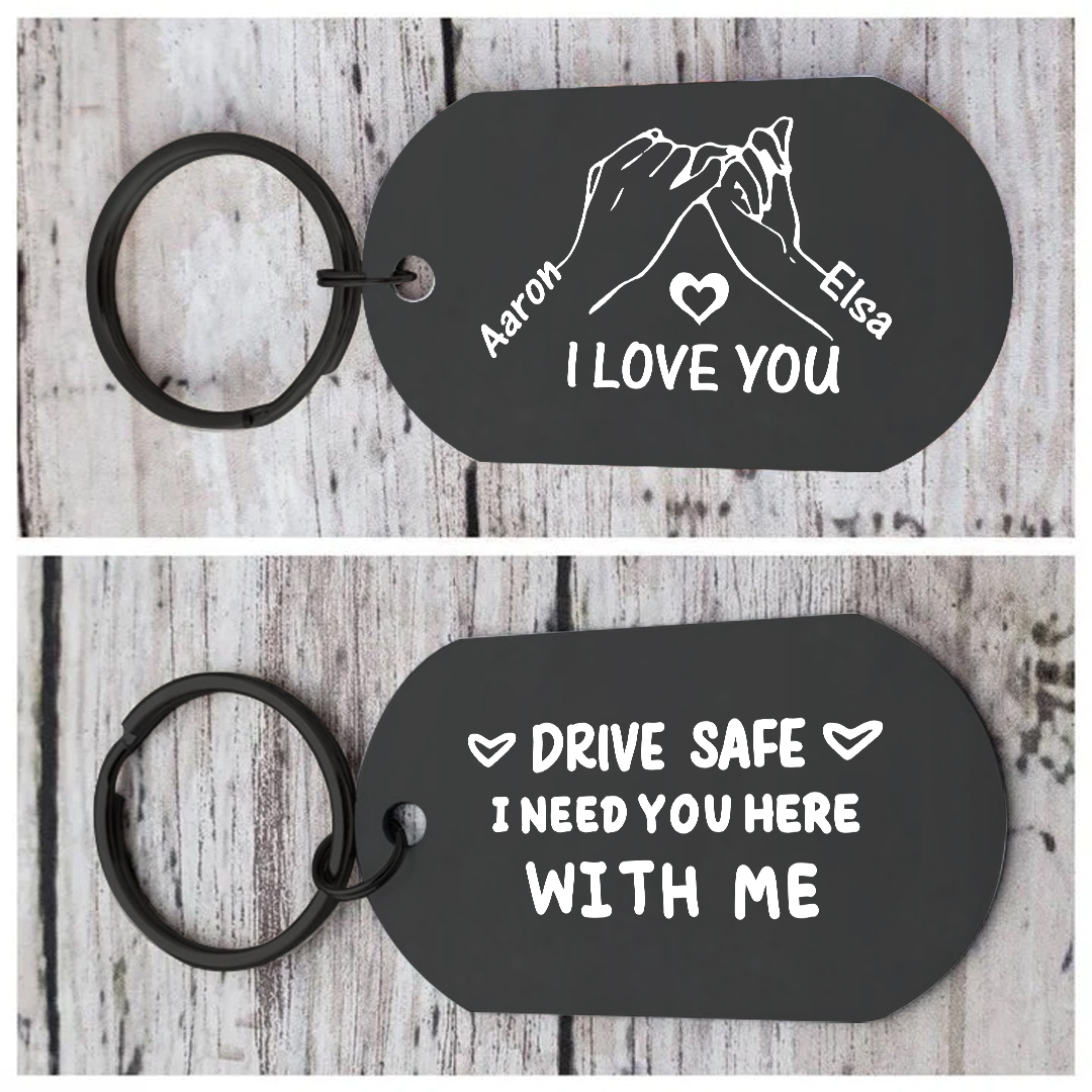 Give a warm and practical gift with this personalized keychain, designed for your partner, a close friend, or any loved one who drives. Engraved with two first names and the tender message “Drive safely, I need you here with me,” it combines safety, practicality, and an everyday declaration of love.