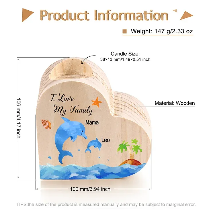 Family Dolphin Heart Candle Holder Personalized Wooden Candlestick Custom 2 Names