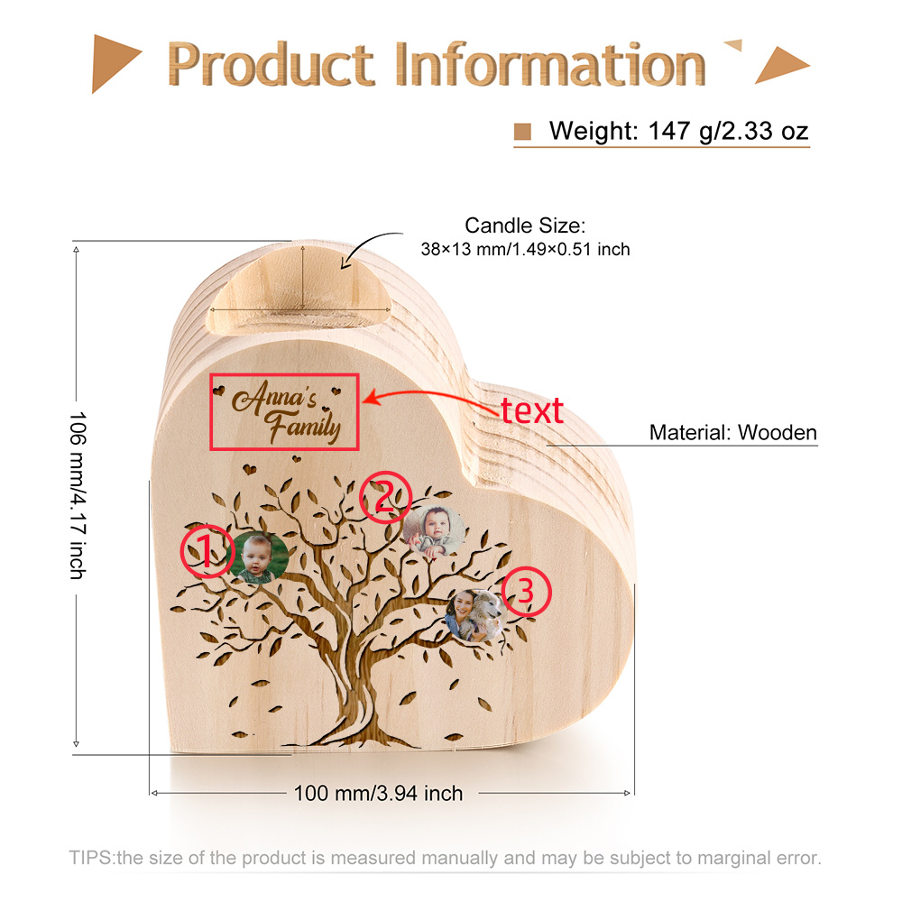 Family Photo Wooden Heart Candle Holder Custom 3 Photos Family Tree Candlesticks