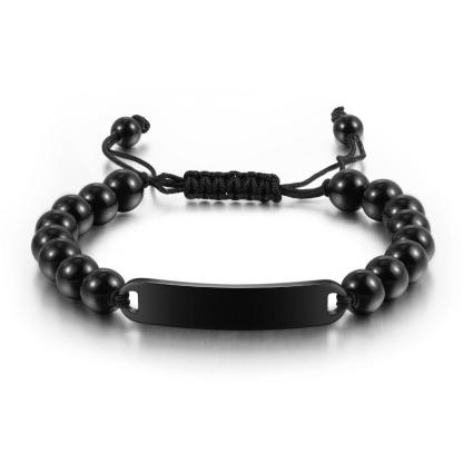 Men Black Beads Bracelet with Engraved Bar Custom Bracelets Personalized Gifts for Him